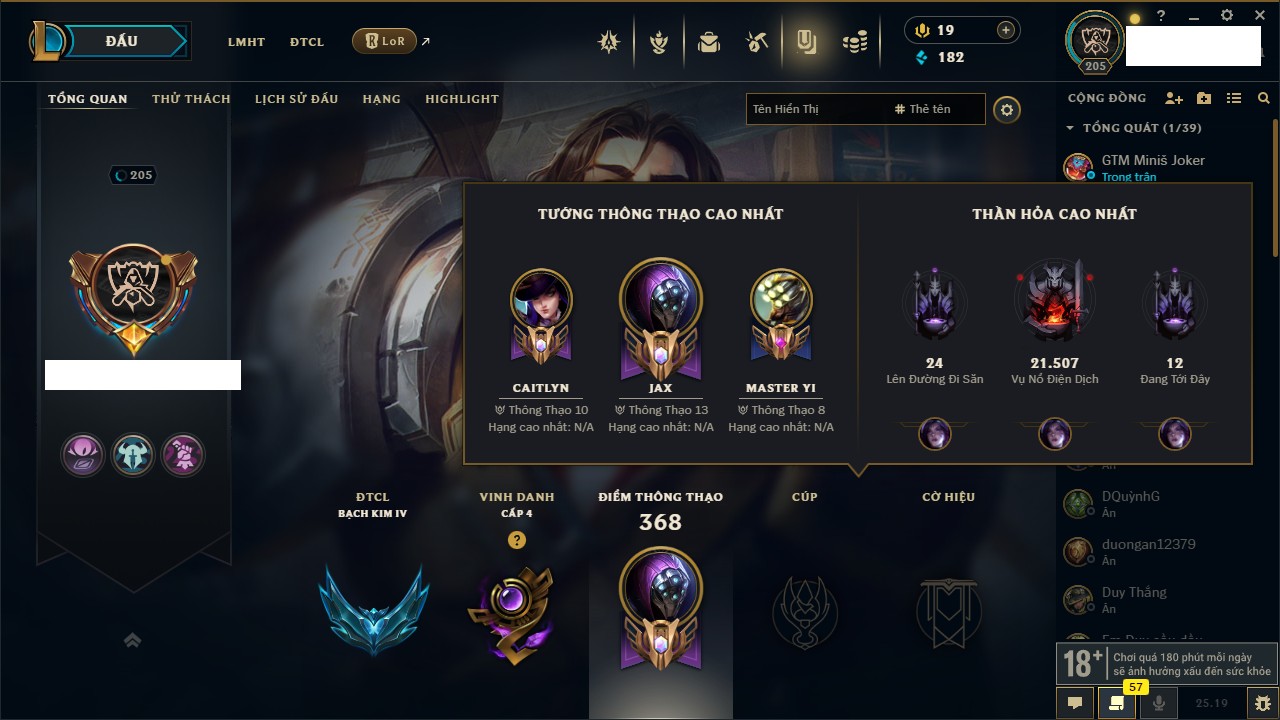 Rank Đơn: Bạc IVKhung: BạcTướng: 171 - Còn 7819 THXTrang Phục: 243Rank ĐTCL: Chưa RankLinh Thú: 102