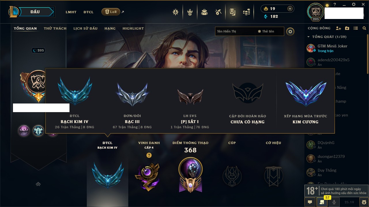 Rank Đơn: Bạc IIIKhung: Chưa có khungTướng: 171 - Còn 21493 THXTrang Phục: 252Rank ĐTCL: Bạch Kim IVLinh Thú: 123