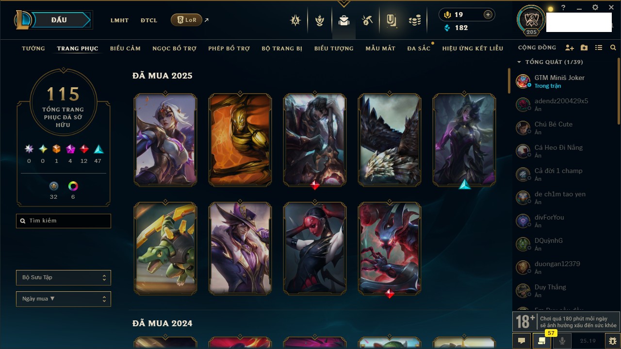Rank Đơn: Vàng IIKhung: VàngTướng: 171 - Còn 34018 THXTrang Phục: 250Rank ĐTCL: Sắt IILinh Thú: 19