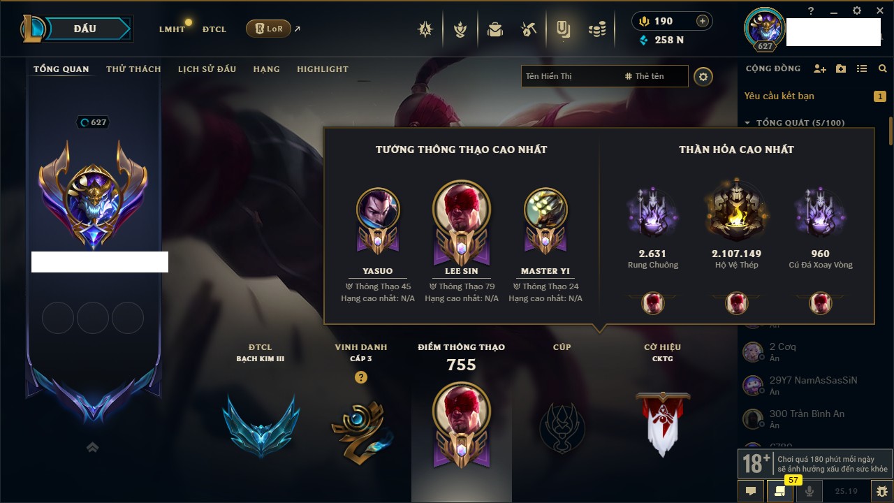 Rank Đơn: Bạch Kim IIKhung: Bạch kimTướng: 171 - Còn 141298 THXTrang Phục: 274Rank ĐTCL: Bạch Kim IILinh Thú: 188