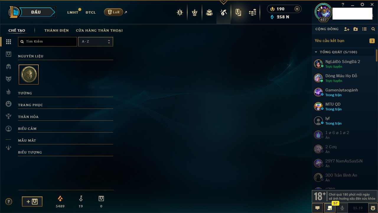 Rank Đơn: Vàng IKhung: BạcTướng: 171 - Còn 60584 THXTrang Phục: 286Rank ĐTCL: Vàng IIILinh Thú: 117