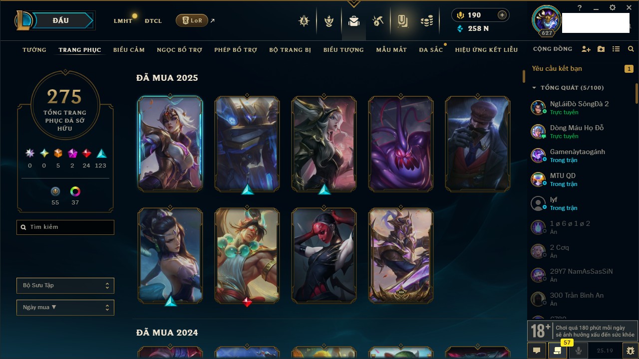 Rank Đơn: Vàng IIIKhung: VàngTướng: 171 - Còn 88128 THXTrang Phục: 329Rank ĐTCL: Chưa RankLinh Thú: 41