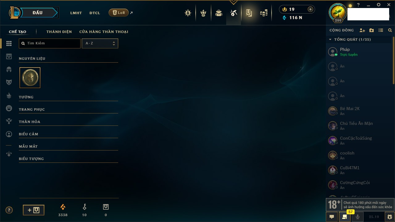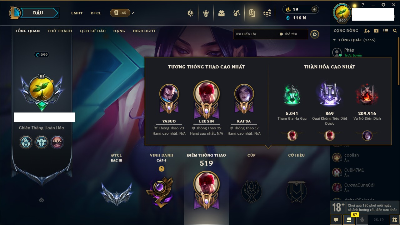 Rank Đơn: Đồng IIKhung: Chưa có khungTướng: 170 - Còn 56487 THXTrang Phục: 90Rank ĐTCL: Chưa RankLinh Thú: 129
