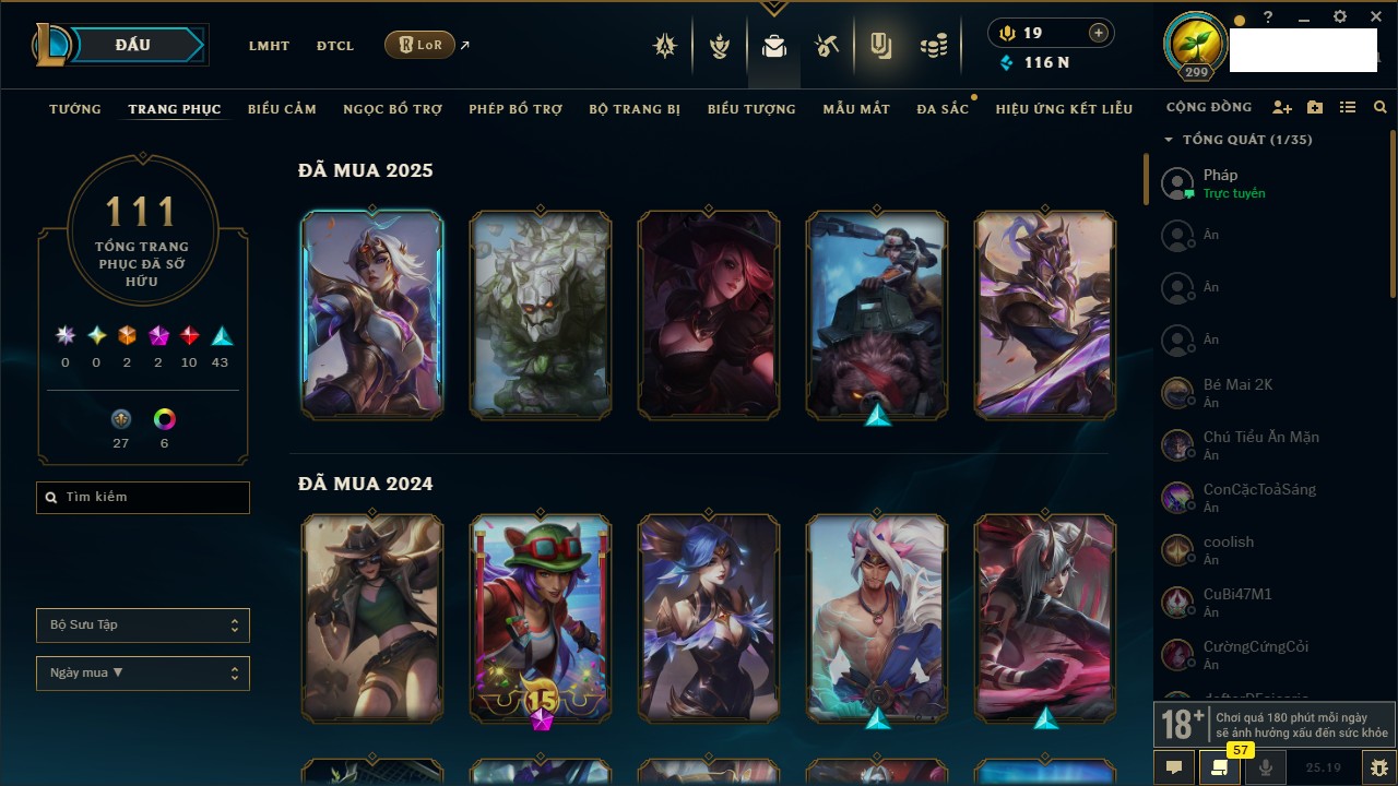 Rank Đơn: Vàng IIIKhung: VàngTướng: 170 - Còn 33222 THXTrang Phục: 136Rank ĐTCL: Chưa RankLinh Thú: 40