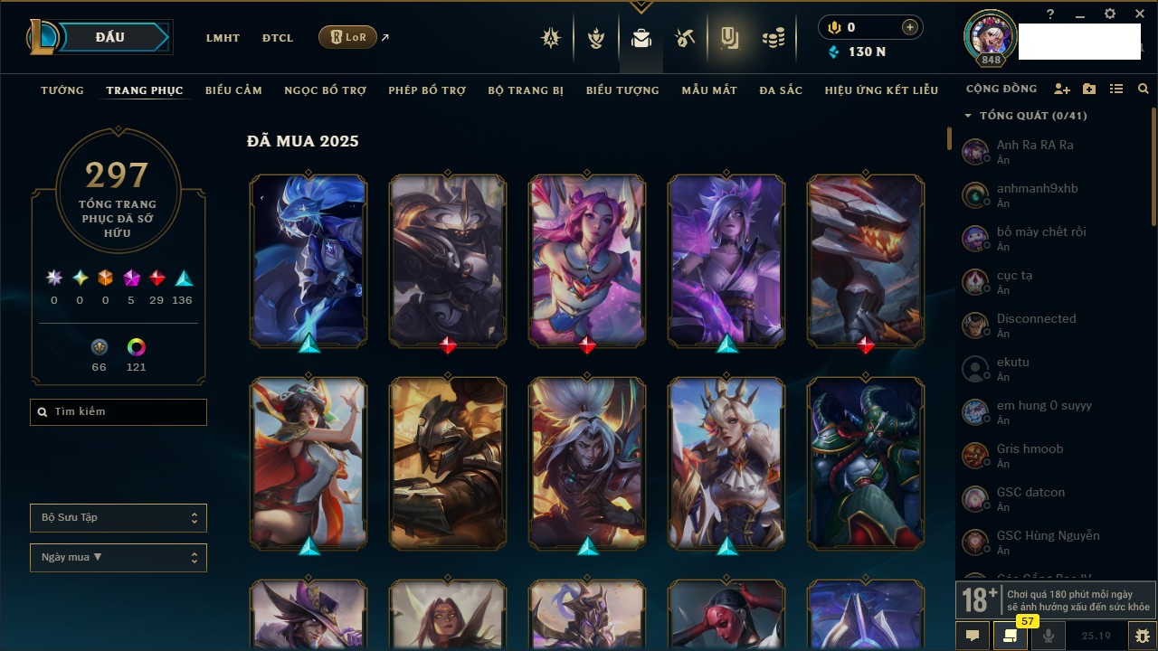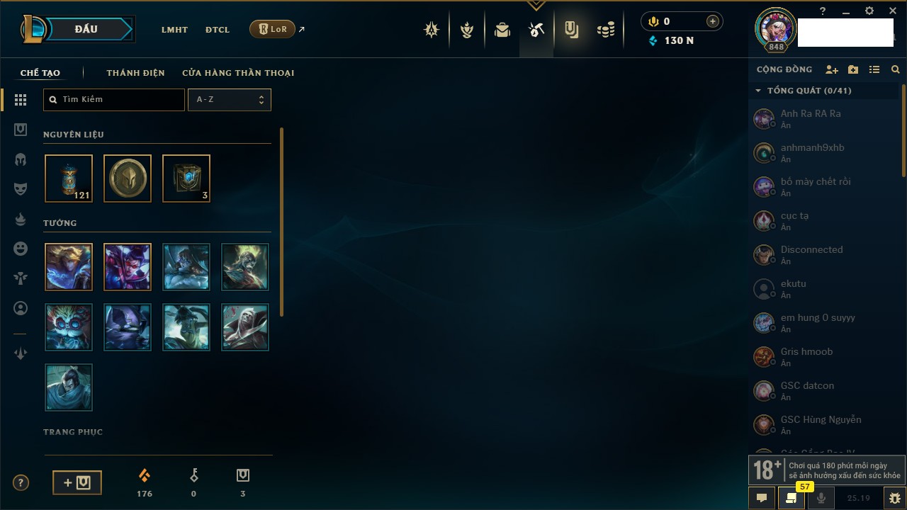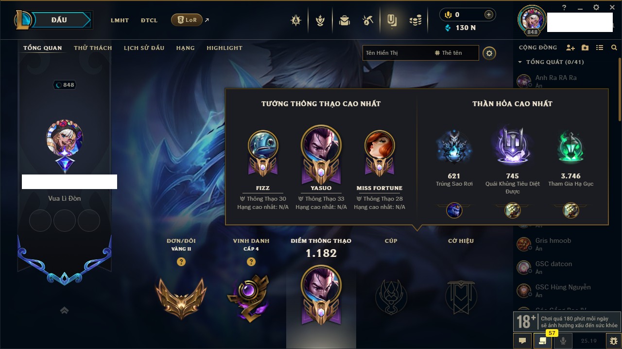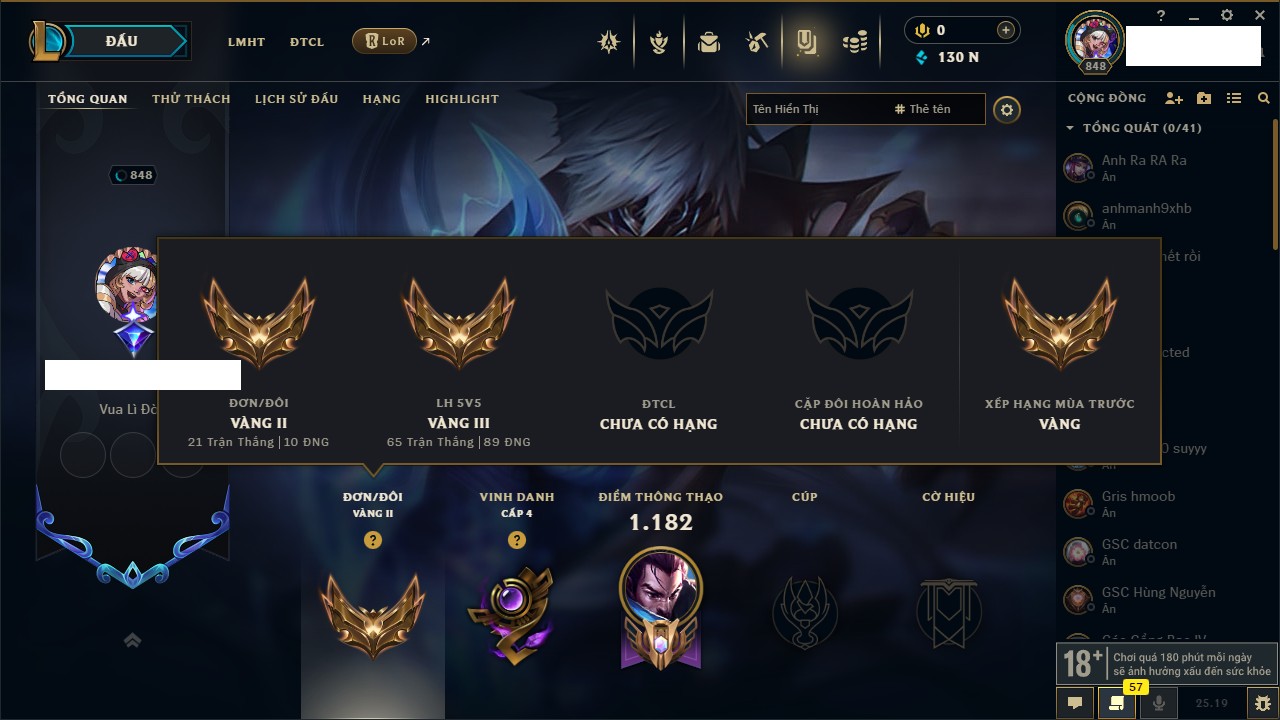 Rank Đơn: Bạc IIKhung: Bạch kimTướng: 169 - Còn 81813 THXTrang Phục: 301Rank ĐTCL: Chưa RankLinh Thú: 140