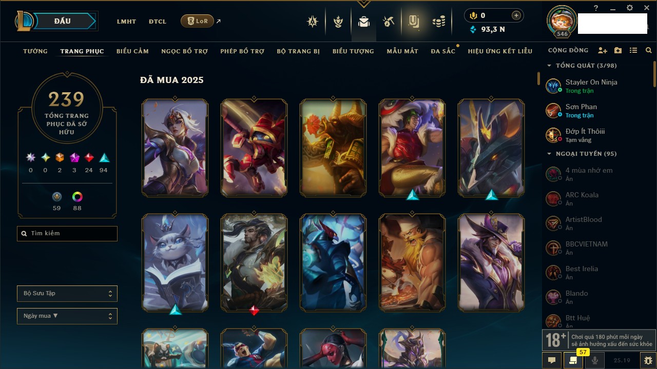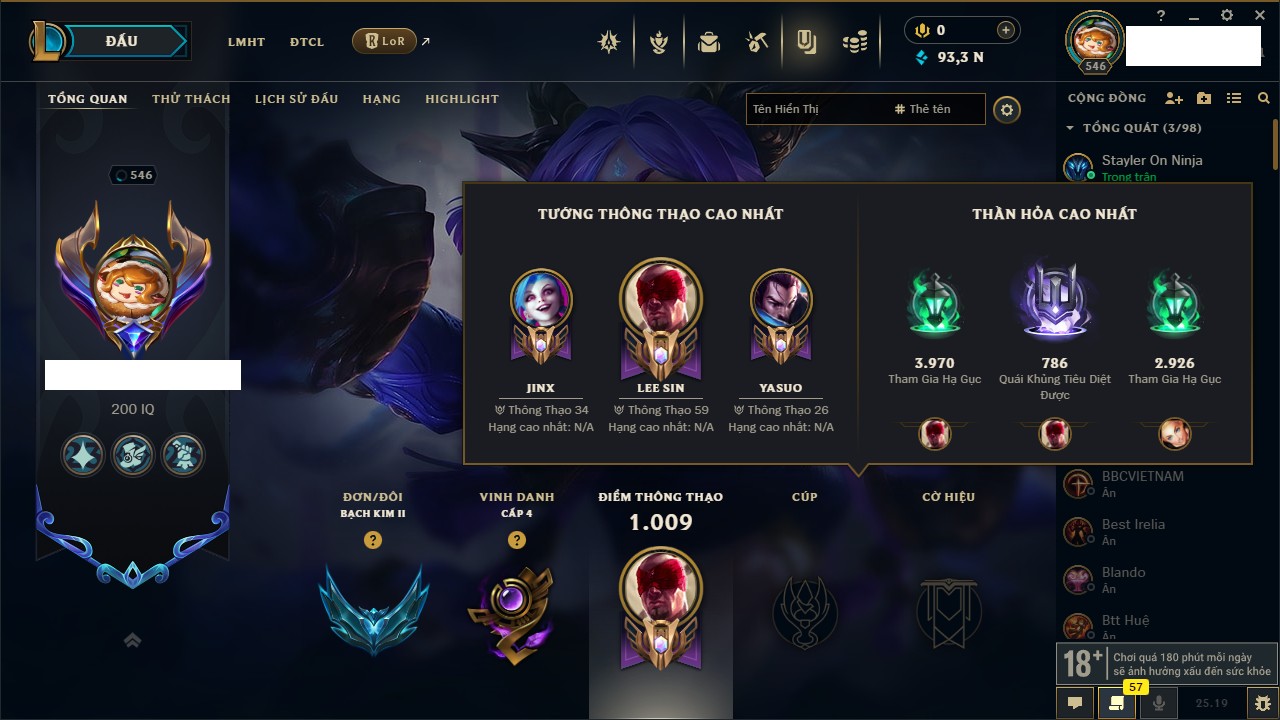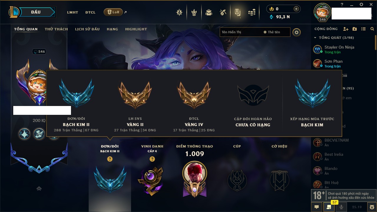 Rank Đơn: Bạch Kim IIKhung: Bạch kimTướng: 171 - Còn 316137 THXTrang Phục: 89Rank ĐTCL: Bạch Kim IIILinh Thú: 94