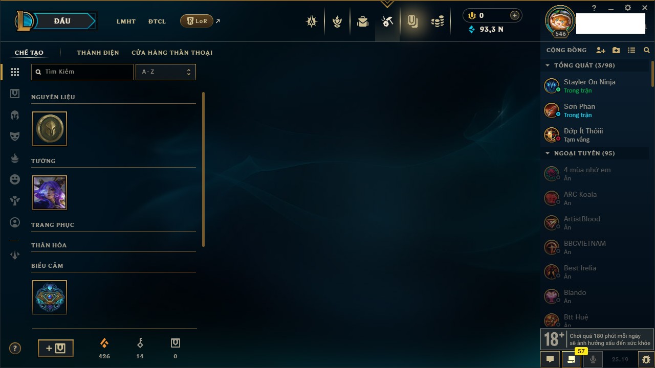 Rank Đơn: Lục Bảo IVKhung: VàngTướng: 171 - Còn 154648 THXTrang Phục: 203Rank ĐTCL: Bạch Kim IVLinh Thú: 69