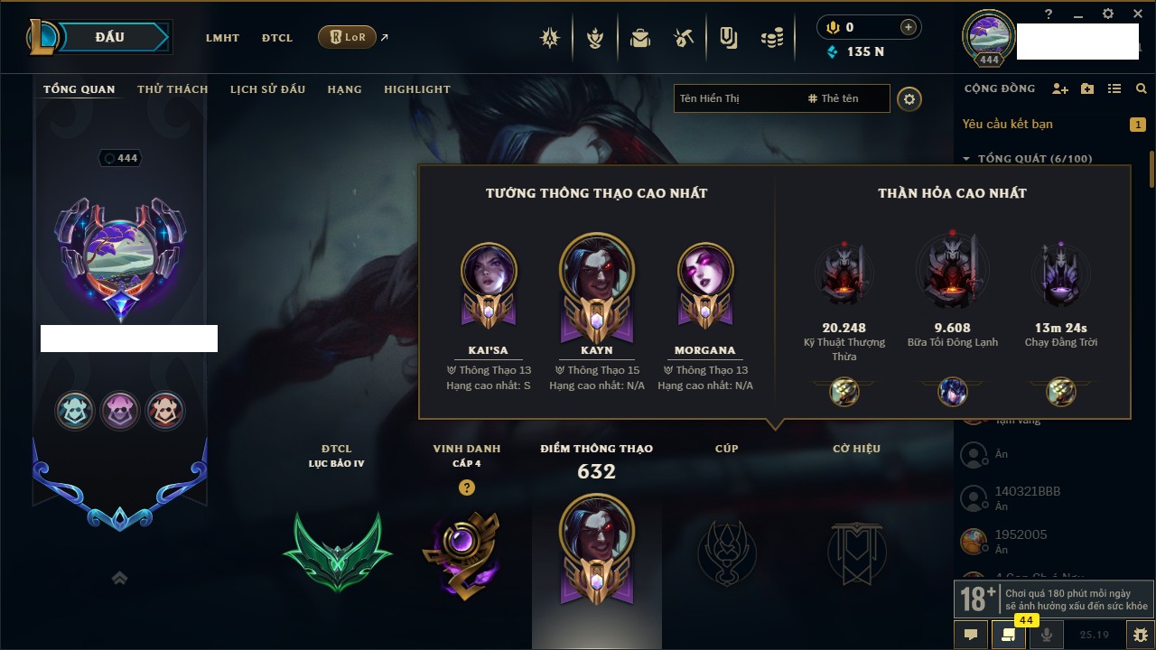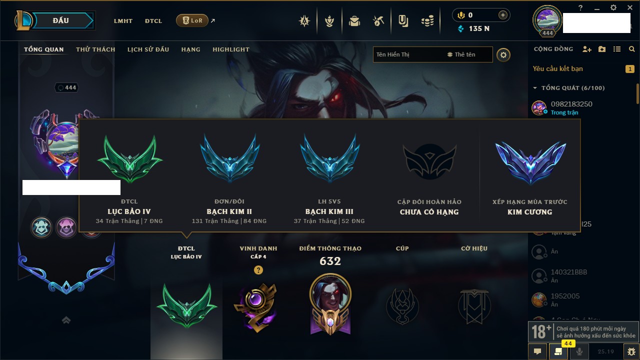 Rank Đơn: Vàng IKhung: Bạch kimTướng: 170 - Còn 212450 THXTrang Phục: 214Rank ĐTCL: Bạch Kim IVLinh Thú: 221