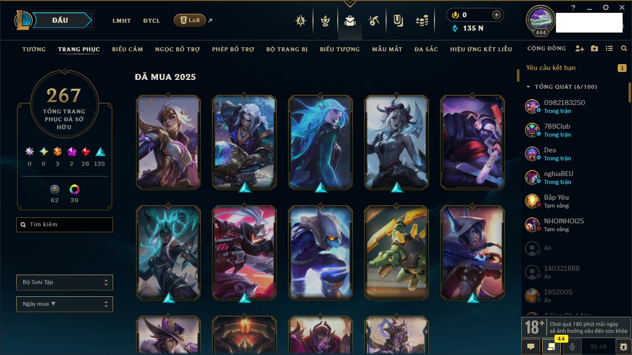 Rank Đơn: Đồng IIIKhung: ĐồngTướng: 170 - Còn 48082 THXTrang Phục: 272Rank ĐTCL: Chưa RankLinh Thú: 84