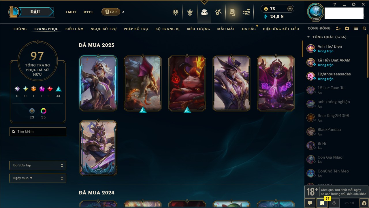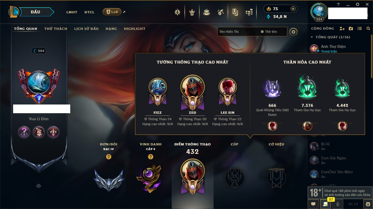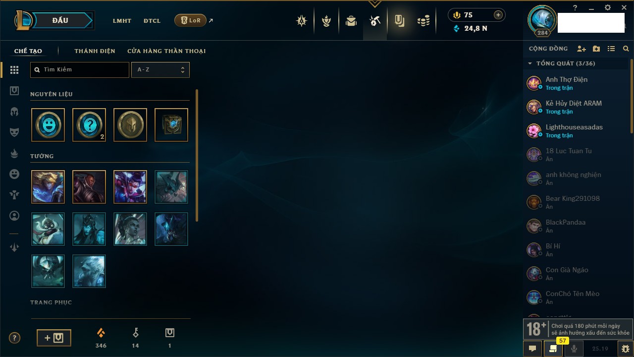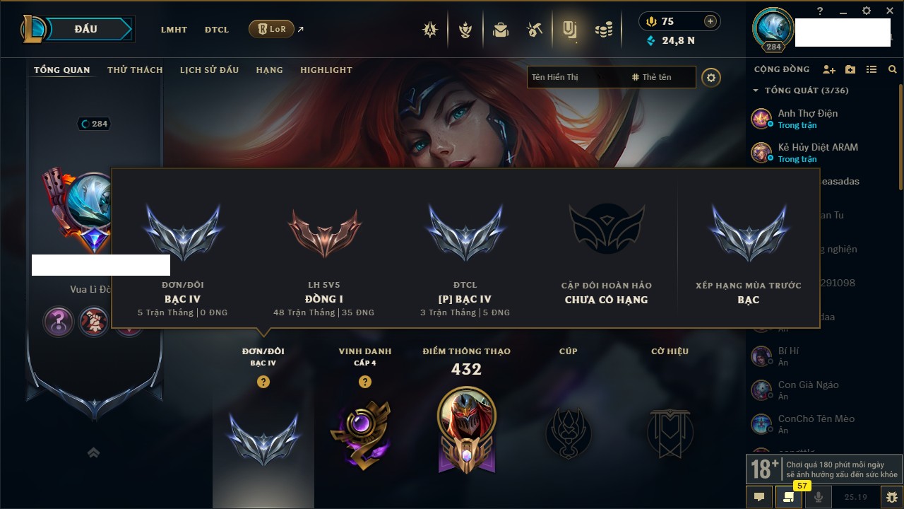 Rank Đơn: Vàng IIIKhung: BạcTướng: 171 - Còn 101359 THXTrang Phục: 88Rank ĐTCL: Kim Cương IVLinh Thú: 200