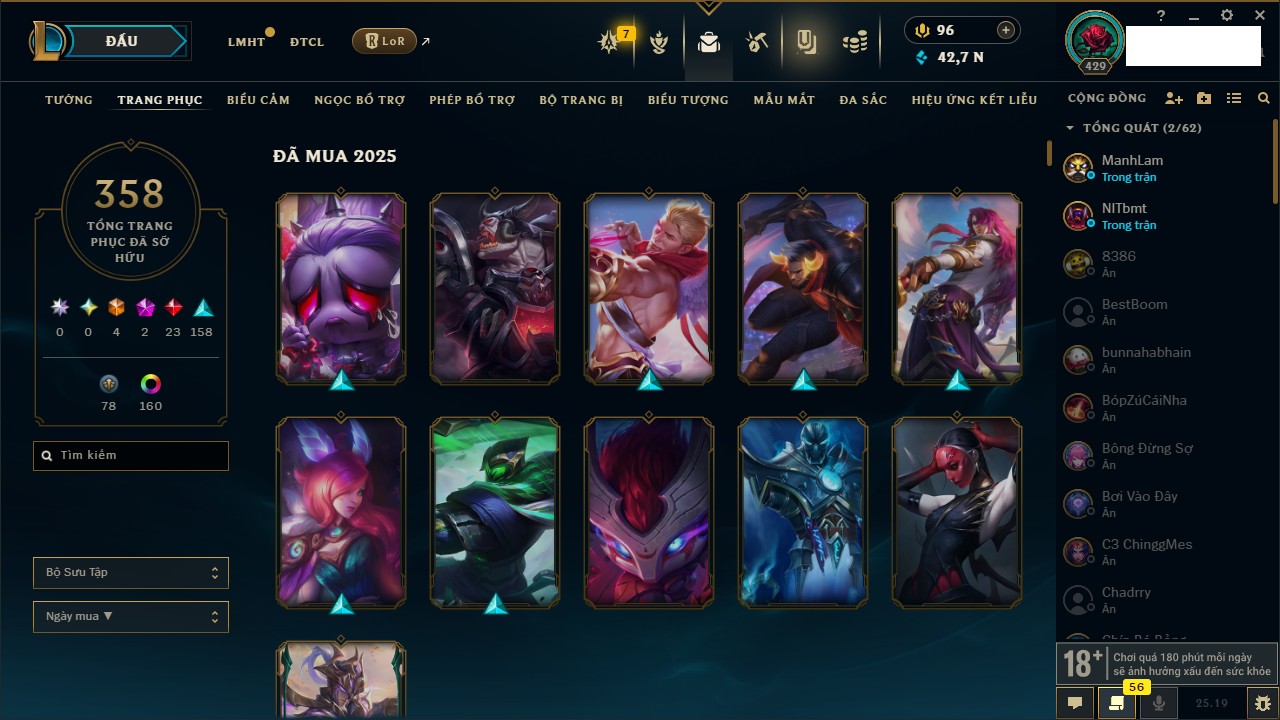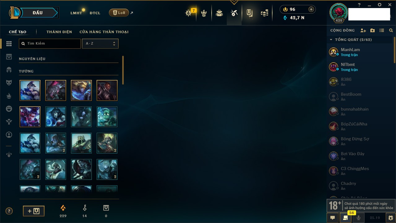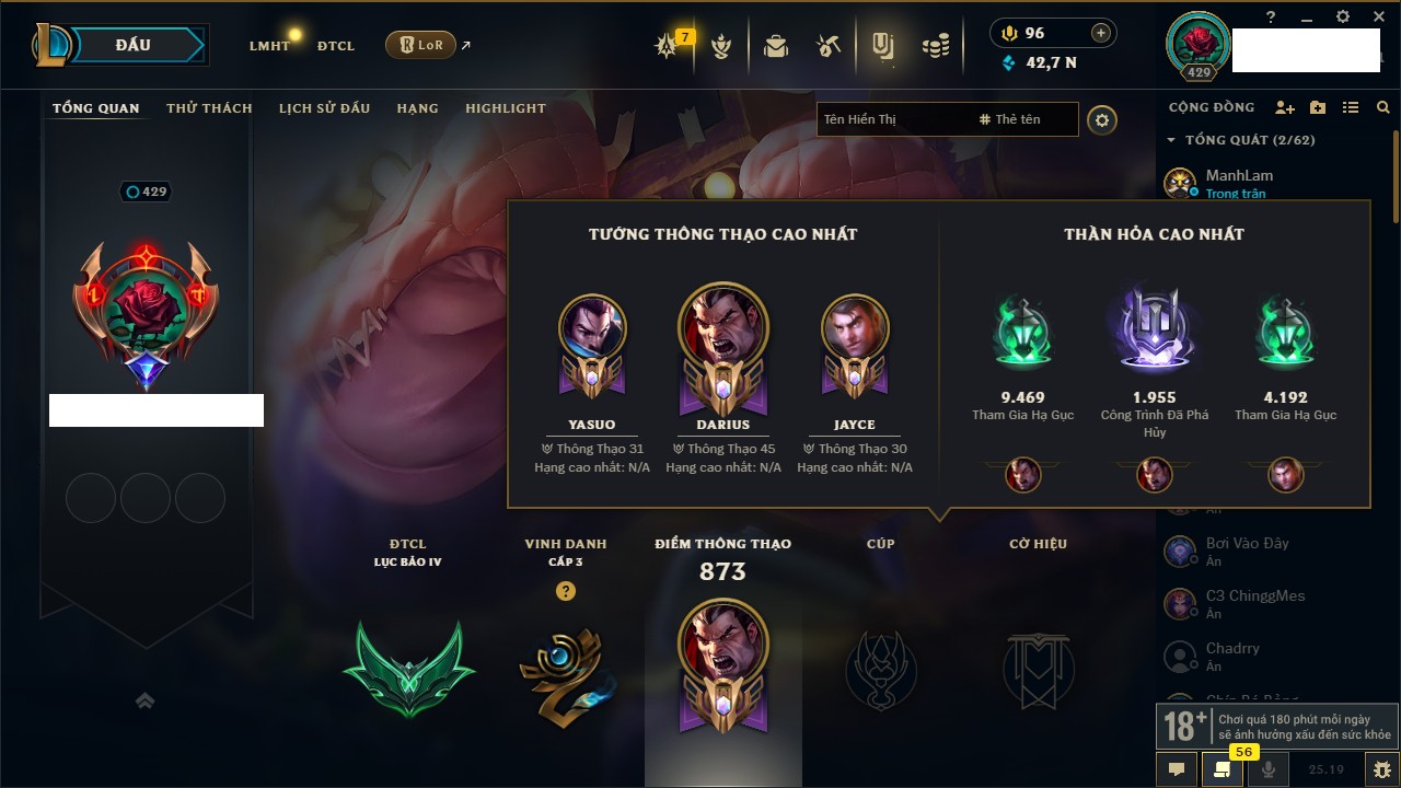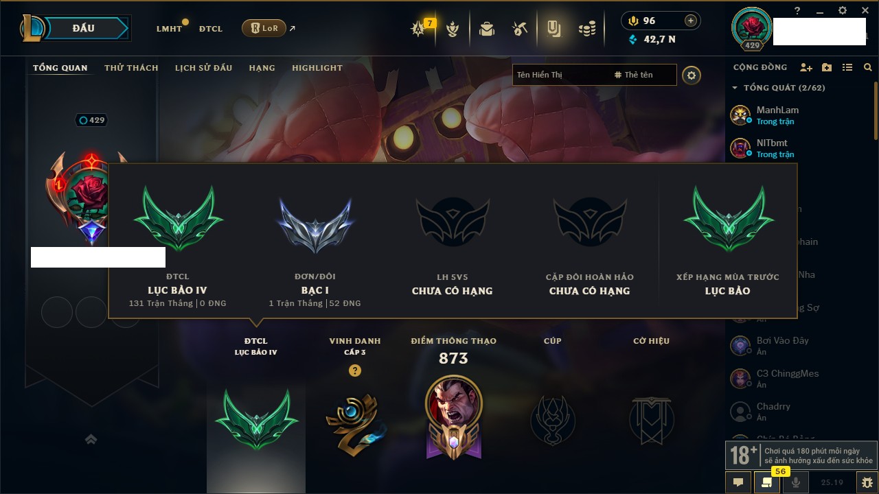 Rank Đơn: Vàng IKhung: Bạch kimTướng: 170 - Còn 212450 THXTrang Phục: 214Rank ĐTCL: Bạch Kim IVLinh Thú: 221