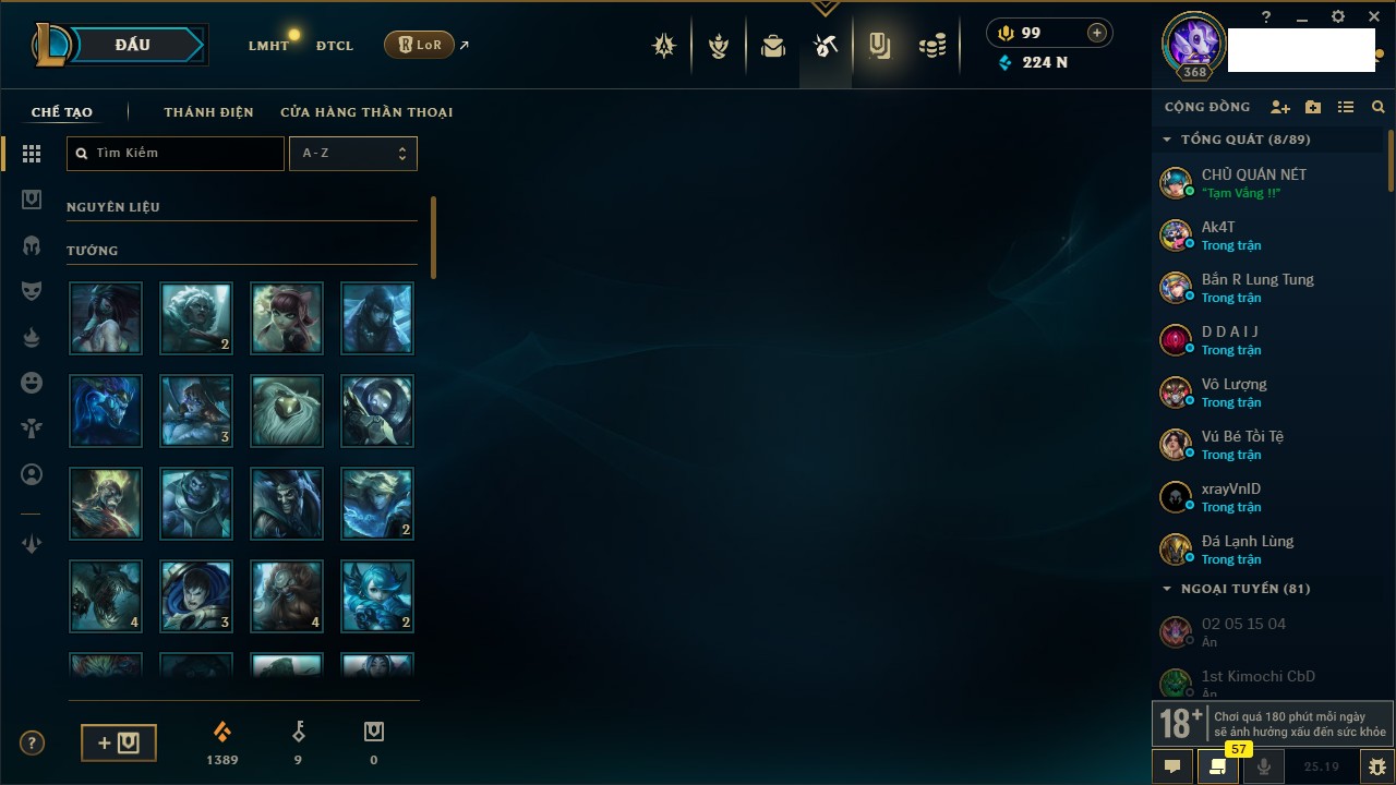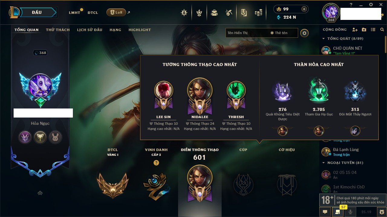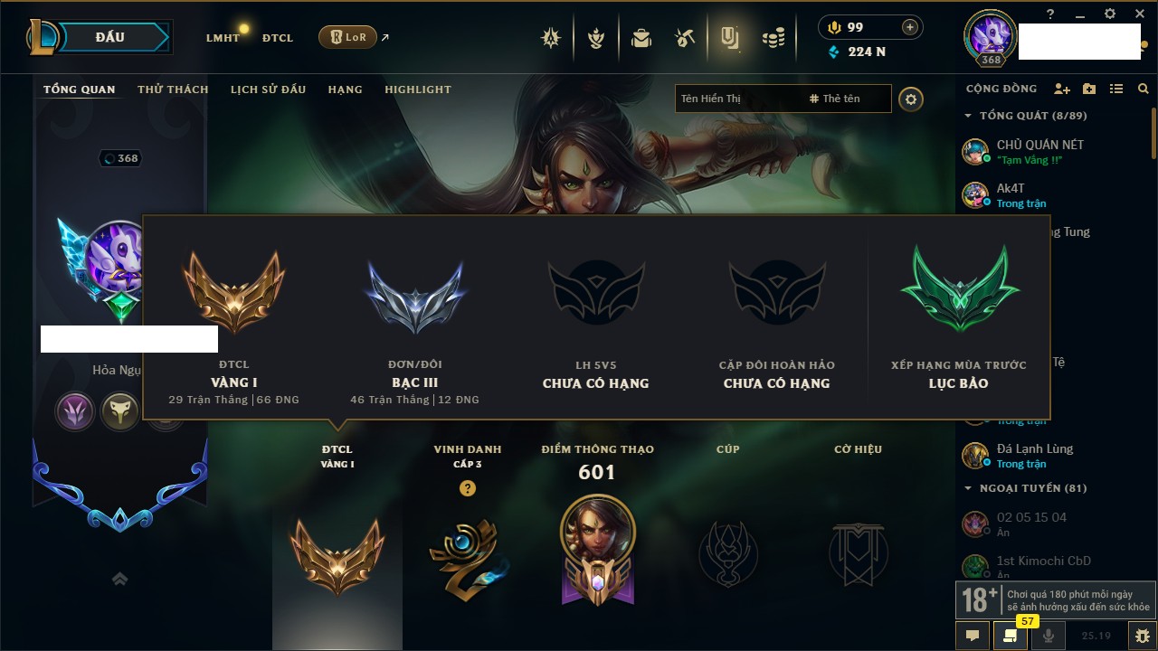 Rank Đơn: Vàng IKhung: BạcTướng: 171 - Còn 60584 THXTrang Phục: 286Rank ĐTCL: Vàng IIILinh Thú: 117