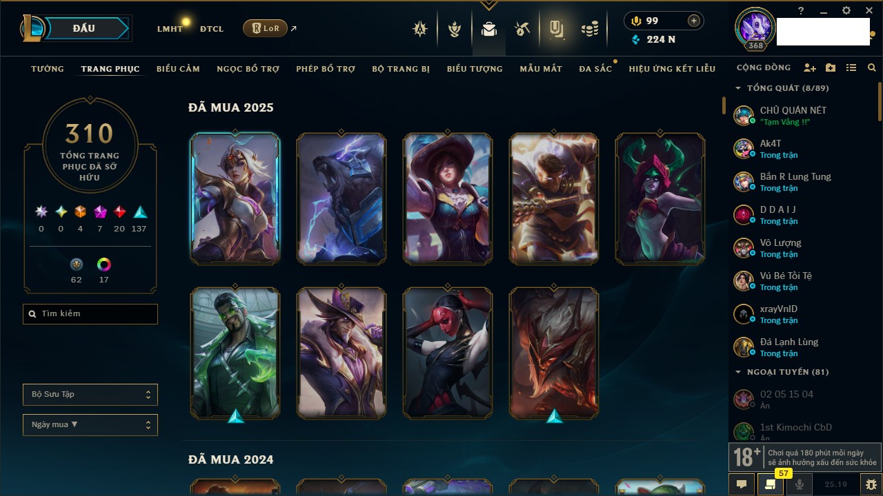 Rank Đơn: Vàng IIIKhung: VàngTướng: 171 - Còn 88128 THXTrang Phục: 329Rank ĐTCL: Chưa RankLinh Thú: 41