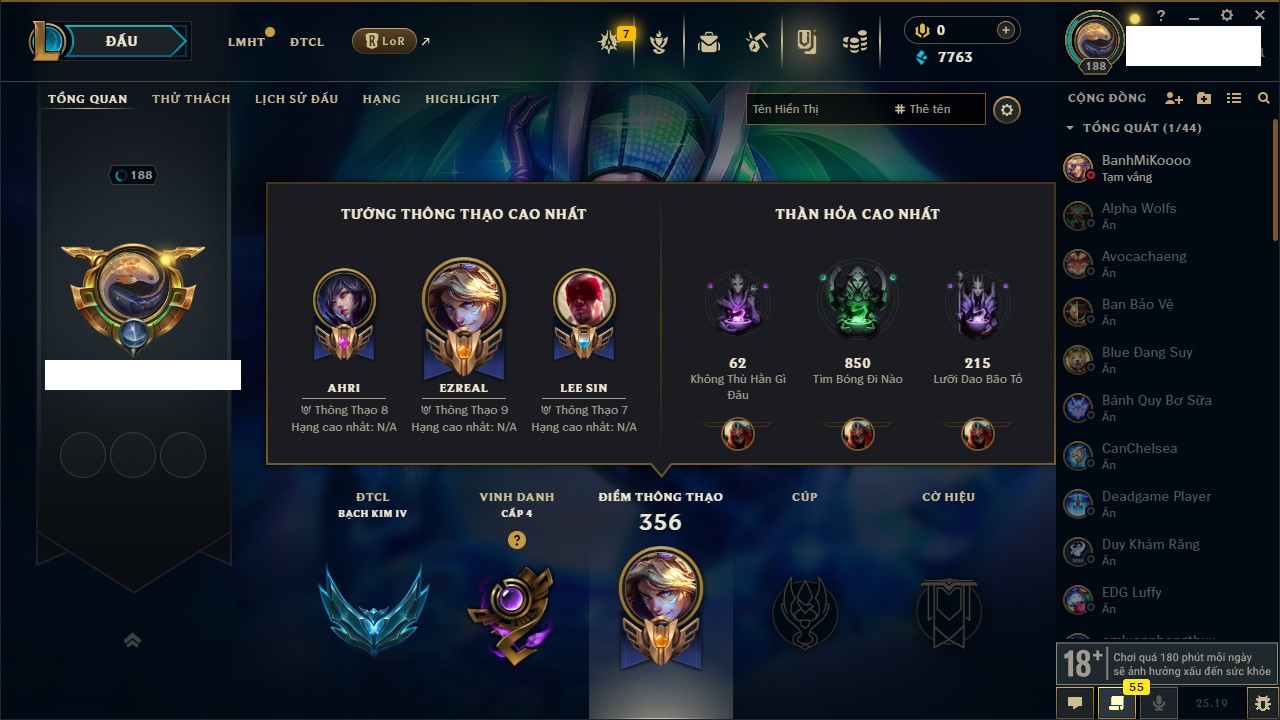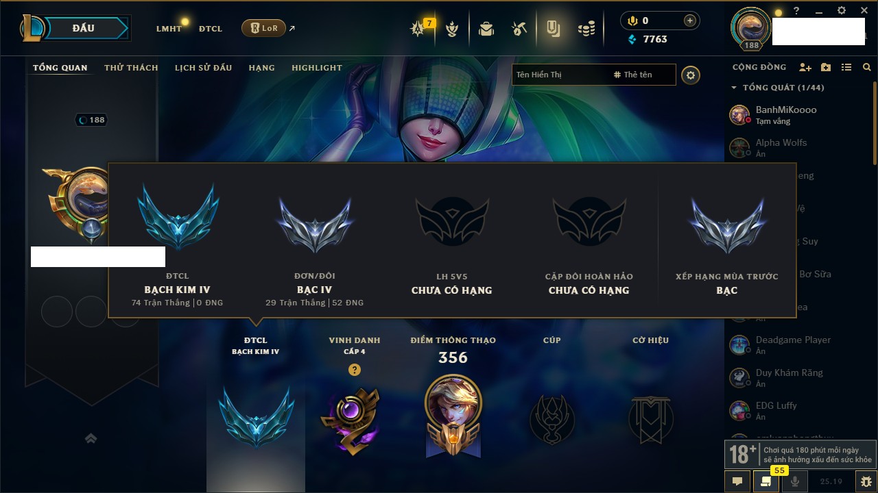 Rank Đơn: Bạch Kim IIKhung: Bạch kimTướng: 171 - Còn 141298 THXTrang Phục: 274Rank ĐTCL: Bạch Kim IILinh Thú: 188
