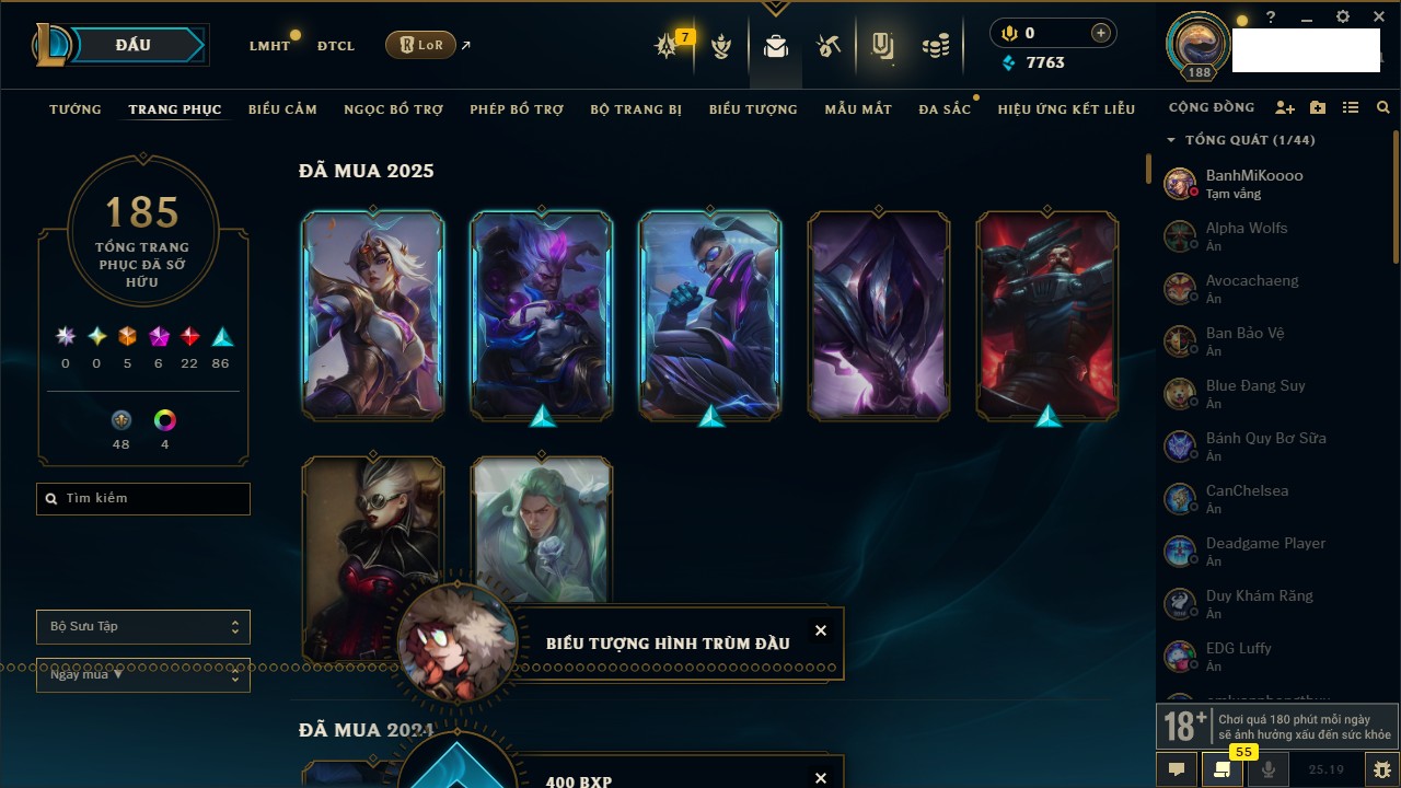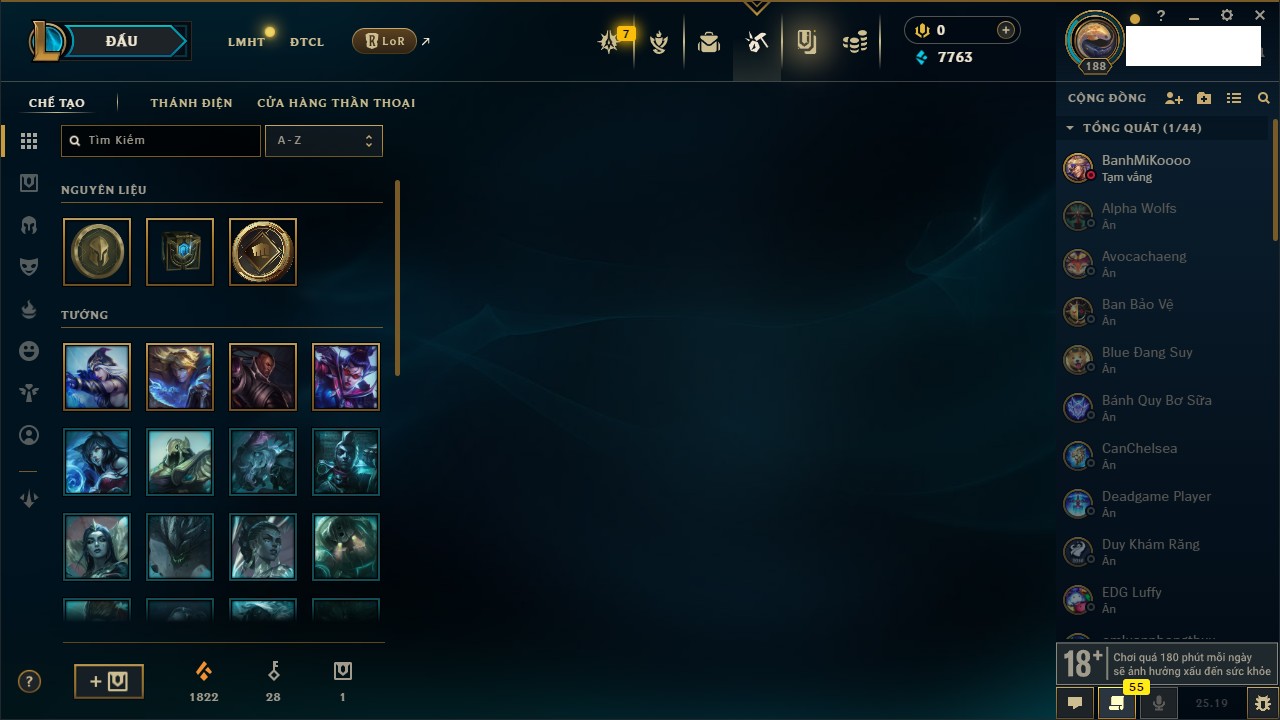 Rank Đơn: Vàng IKhung: BạcTướng: 171 - Còn 60584 THXTrang Phục: 286Rank ĐTCL: Vàng IIILinh Thú: 117