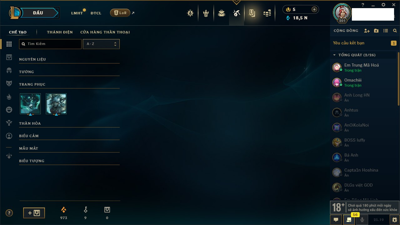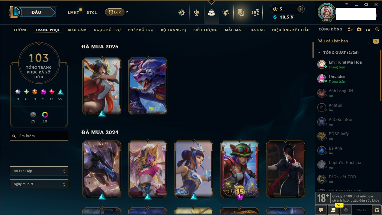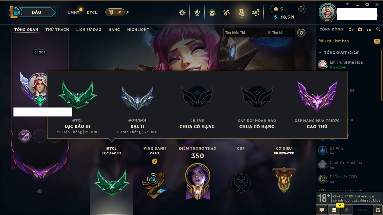 Rank Đơn: Chưa Rank Khung: Chưa có khung Tướng: 171 - Còn 52162 THX Trang Phục: 78 Rank ĐTCL: Chưa Rank Linh Thú: 145