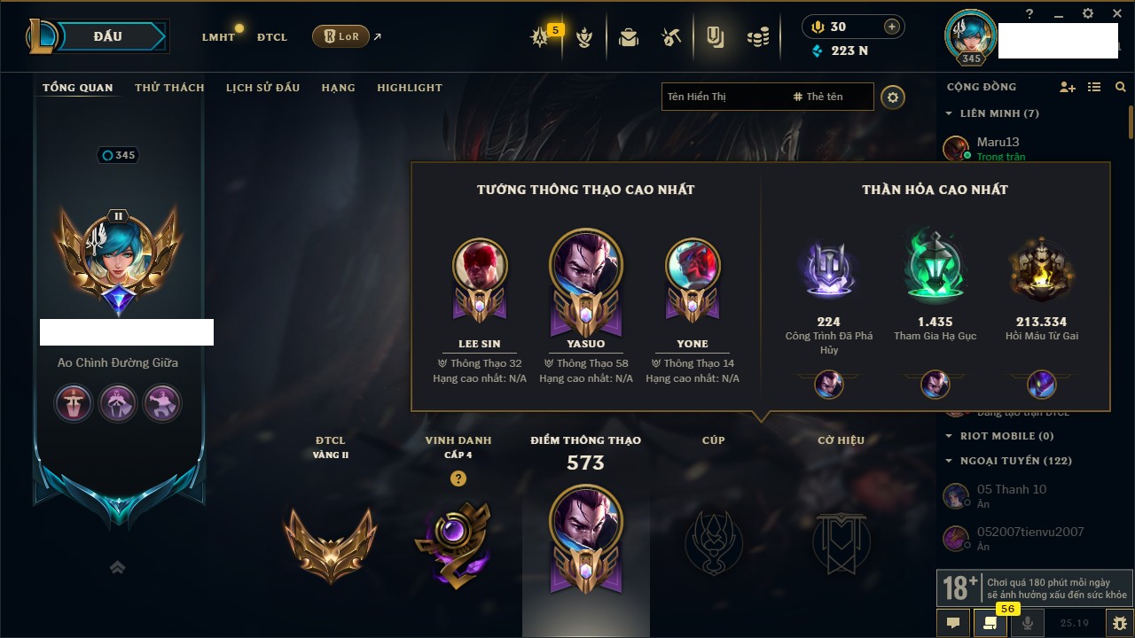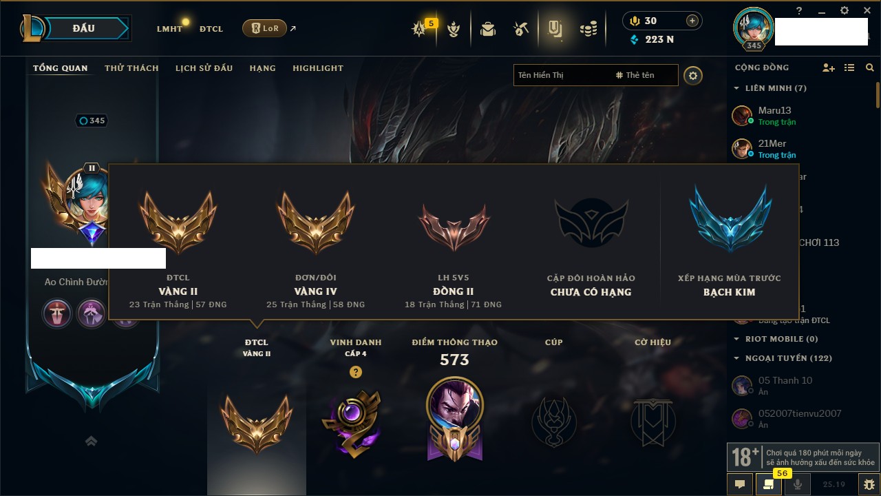 Rank Đơn: Bạch Kim IIKhung: Bạch kimTướng: 171 - Còn 316137 THXTrang Phục: 89Rank ĐTCL: Bạch Kim IIILinh Thú: 94