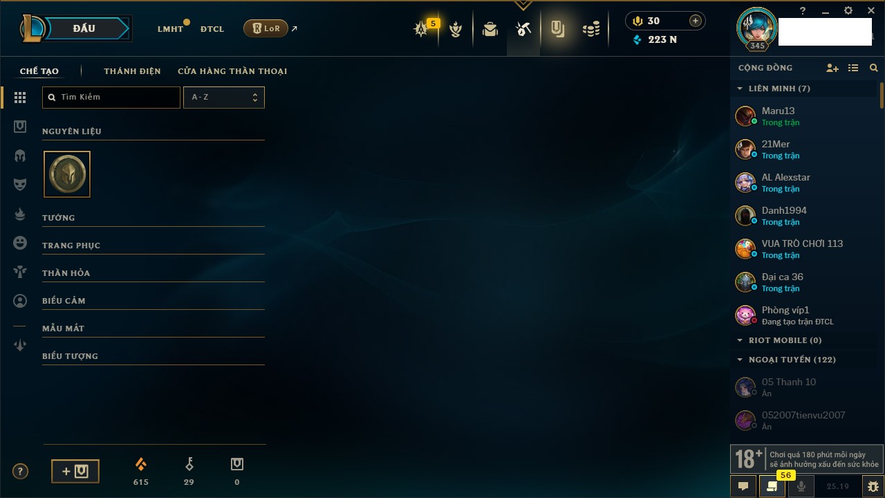 Rank Đơn: Lục Bảo IVKhung: VàngTướng: 171 - Còn 154648 THXTrang Phục: 203Rank ĐTCL: Bạch Kim IVLinh Thú: 69