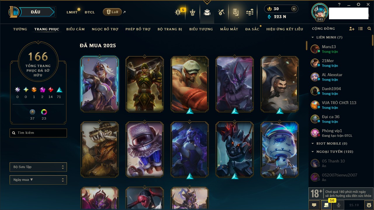 Rank Đơn: Vàng IIKhung: VàngTướng: 170 - Còn 243330 THXTrang Phục: 230Rank ĐTCL: Chưa RankLinh Thú: 68