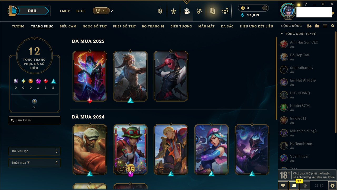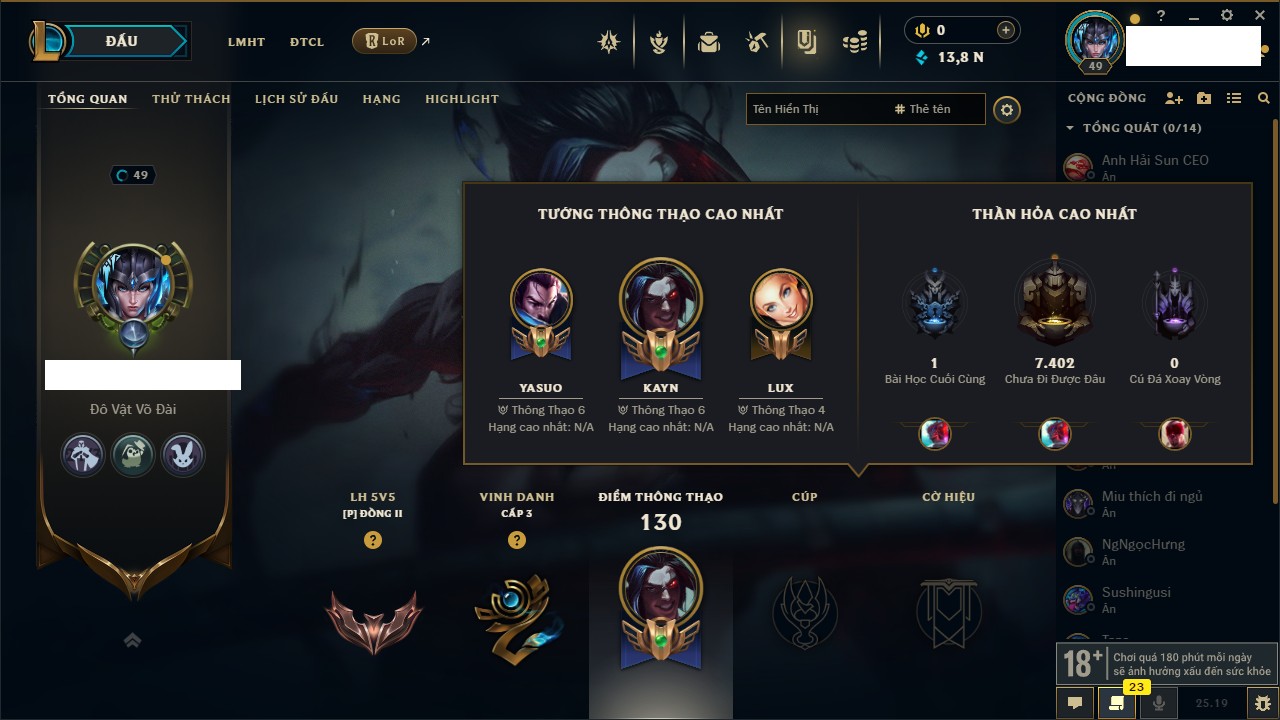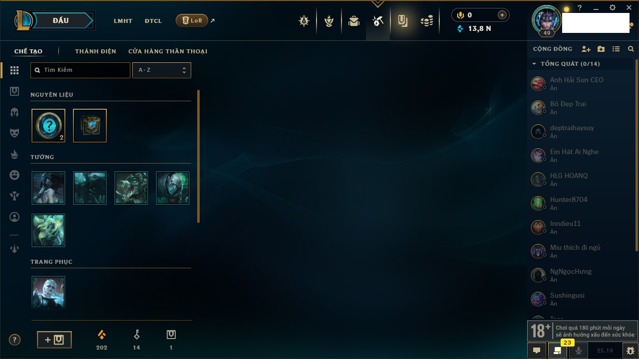 Rank Đơn: Vàng IIIKhung: BạcTướng: 171 - Còn 101359 THXTrang Phục: 88Rank ĐTCL: Kim Cương IVLinh Thú: 200