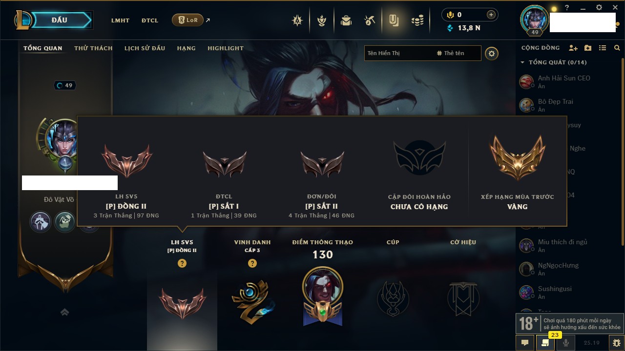 Rank Đơn: Đồng IIKhung: ĐồngTướng: 170 - Còn 66145 THXTrang Phục: 215Rank ĐTCL: Chưa RankLinh Thú: 52
