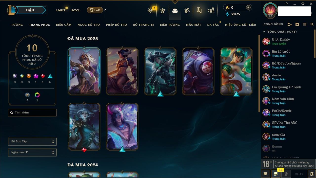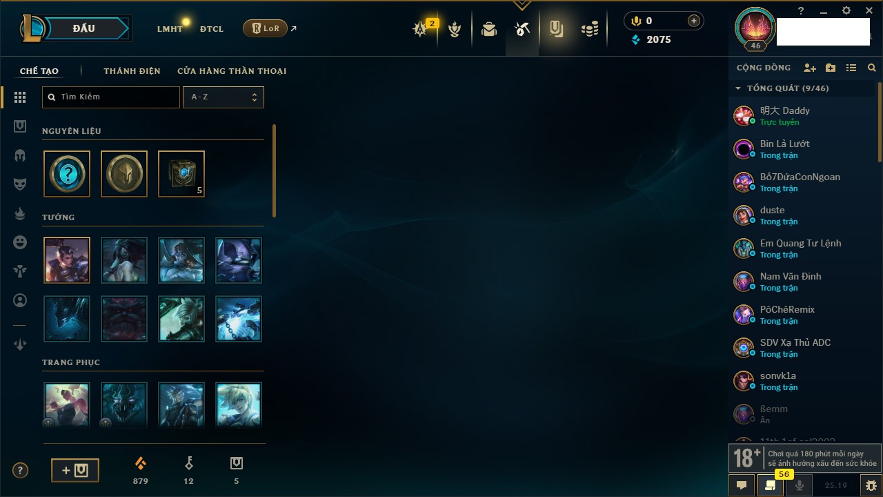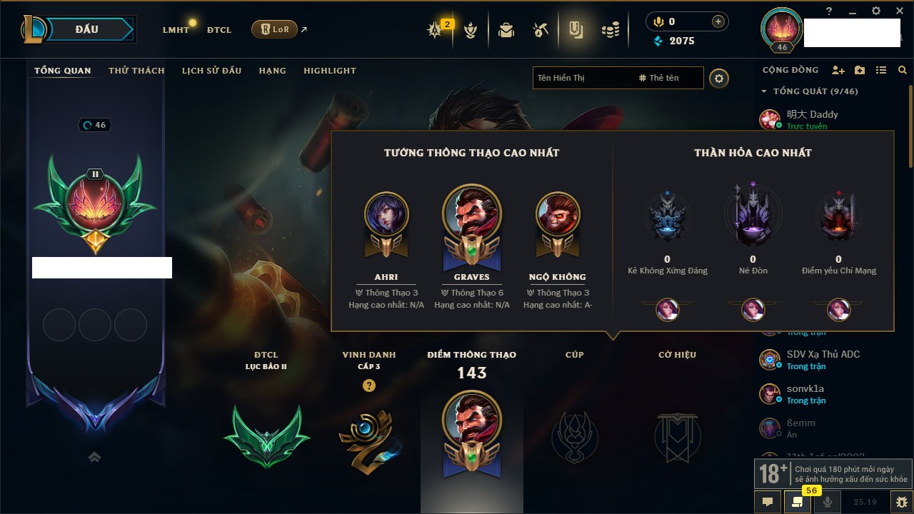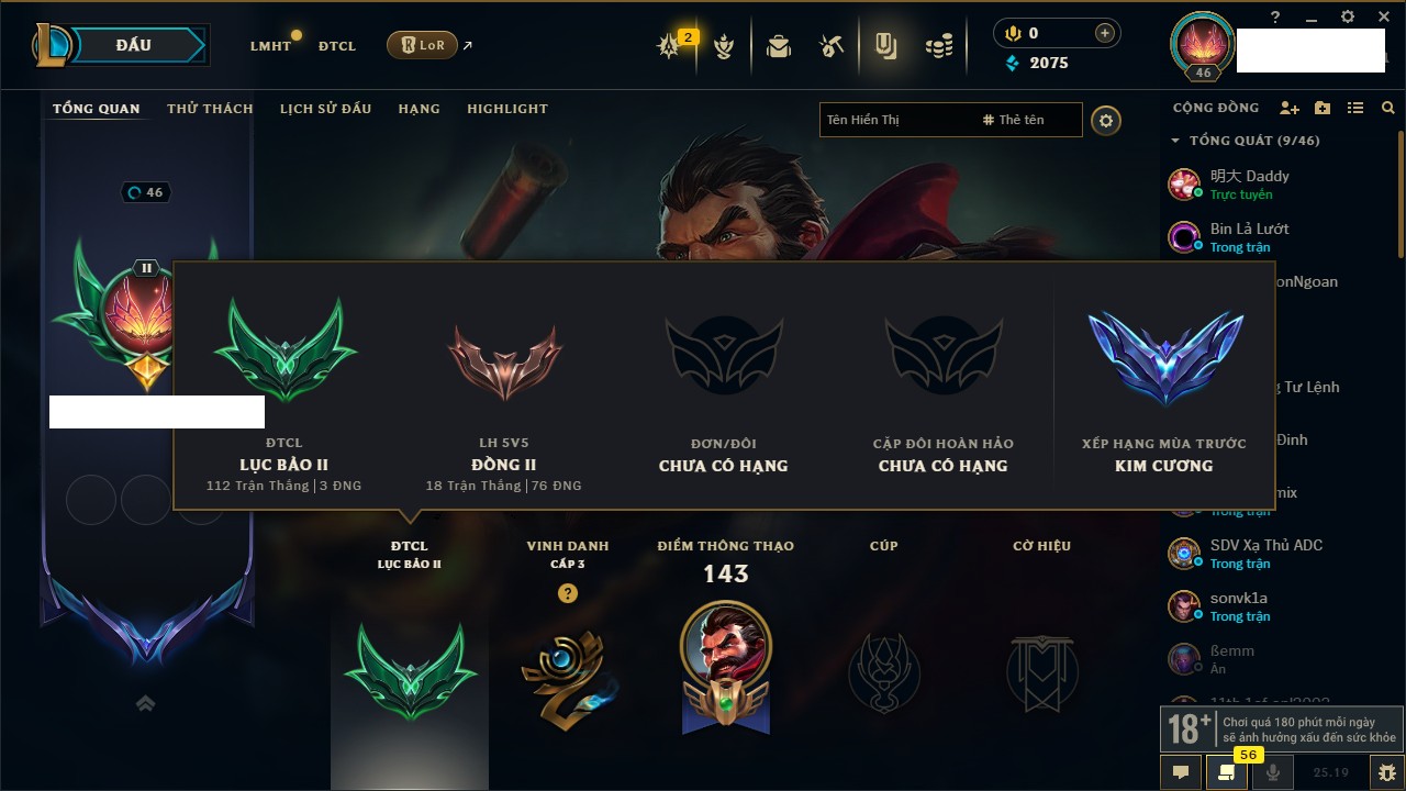 Rank Đơn: Đồng IIKhung: Chưa có khungTướng: 170 - Còn 56487 THXTrang Phục: 90Rank ĐTCL: Chưa RankLinh Thú: 129