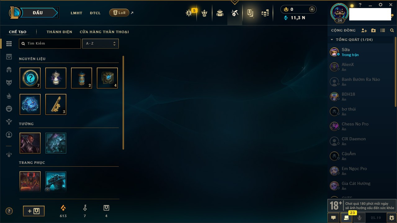 Rank Đơn: Vàng IVKhung: BạcTướng: 166 - Còn 180925 THXTrang Phục: 163Rank ĐTCL: Chưa RankLinh Thú: 67