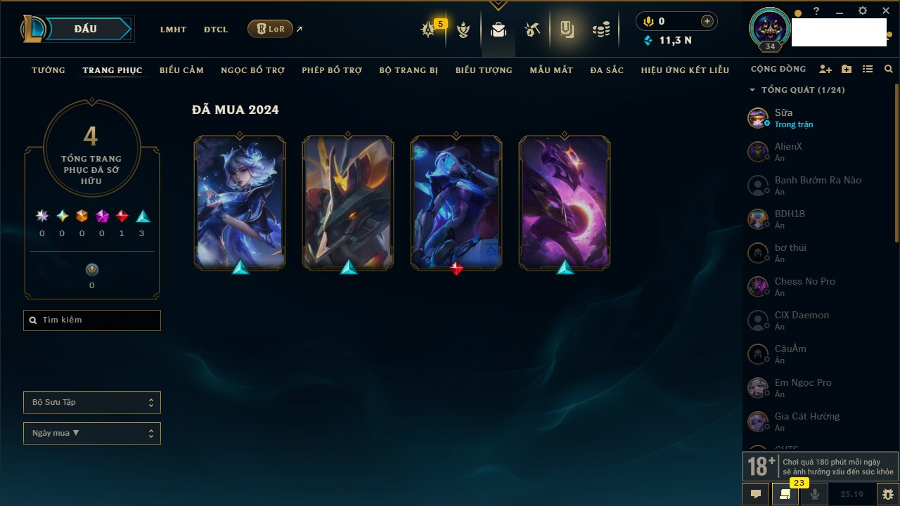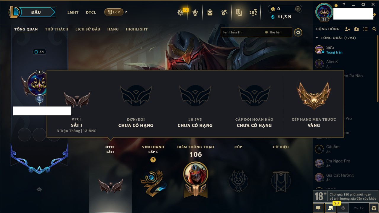 Rank Đơn: Vàng IVKhung: VàngTướng: 171 - Còn 48721 THXTrang Phục: 171Rank ĐTCL: Chưa RankLinh Thú: 27