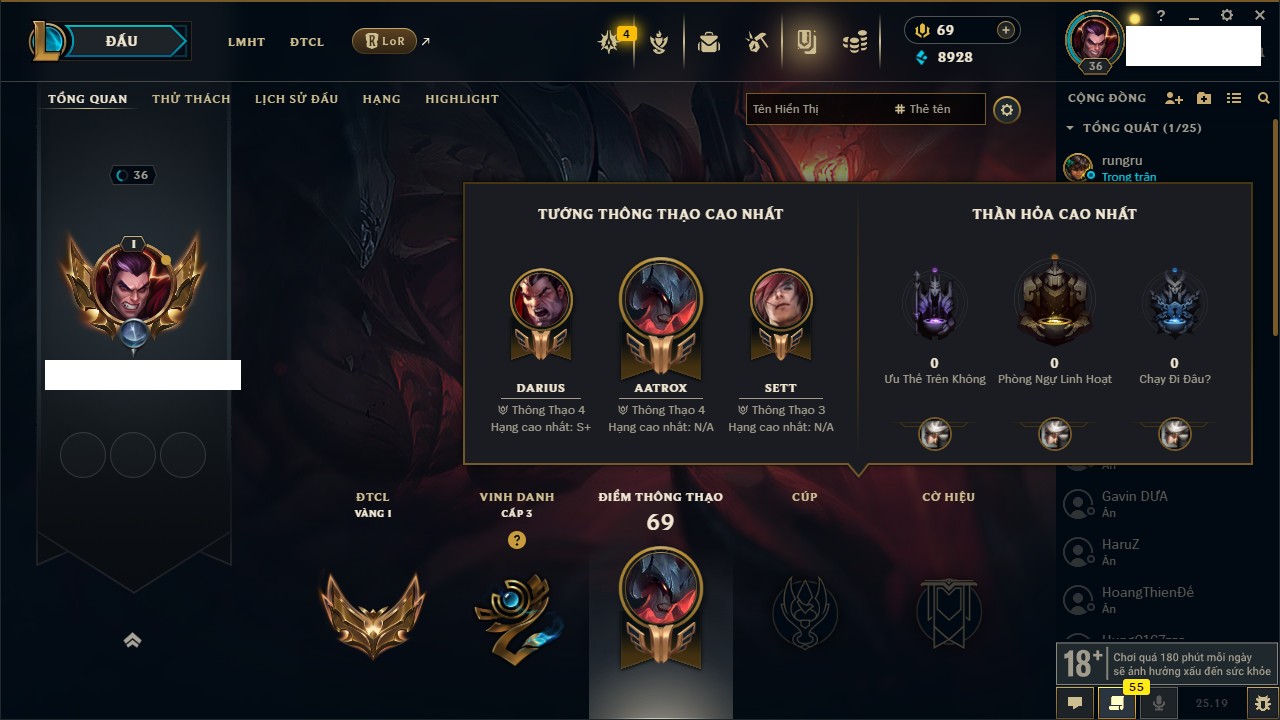 Rank Đơn: Bạc III Khung: Bạc Tướng: 170 - Còn 30078 THX Trang Phục: 225 Rank ĐTCL: Chưa Rank Linh Thú: 138