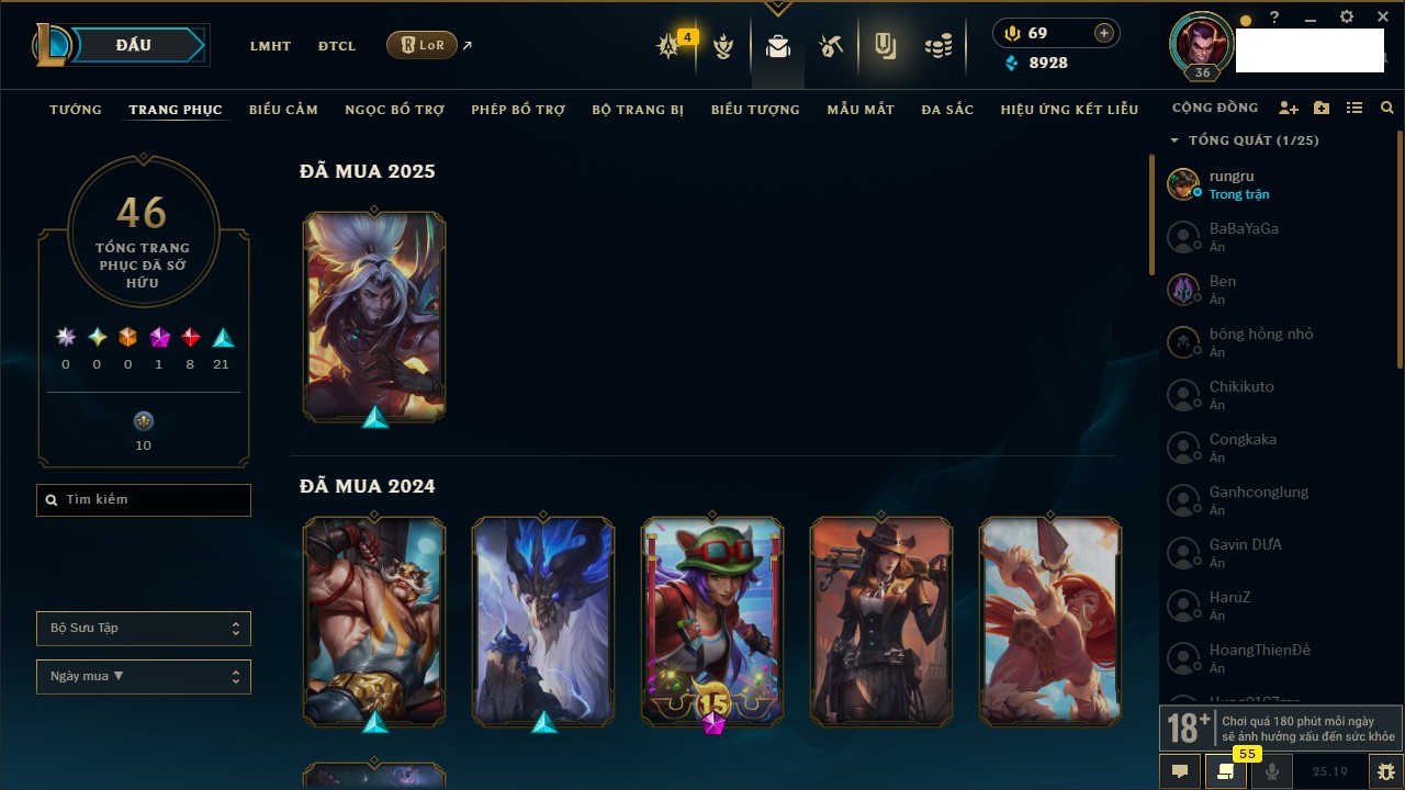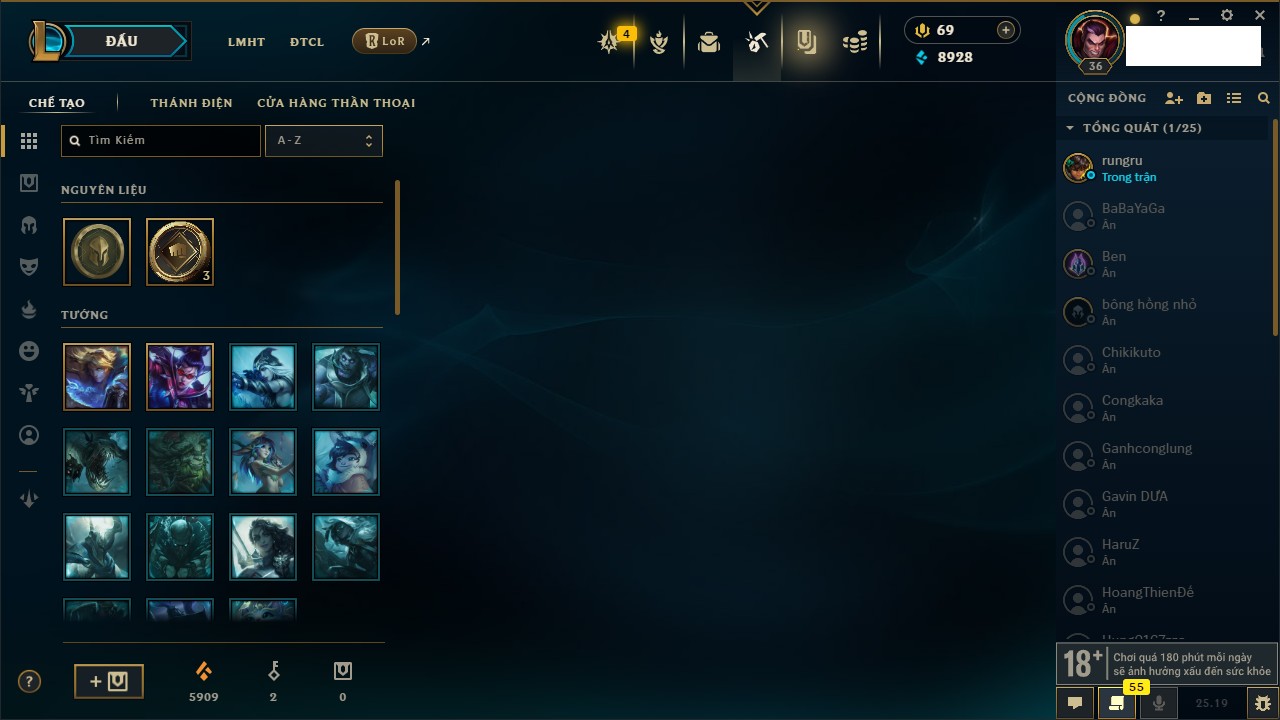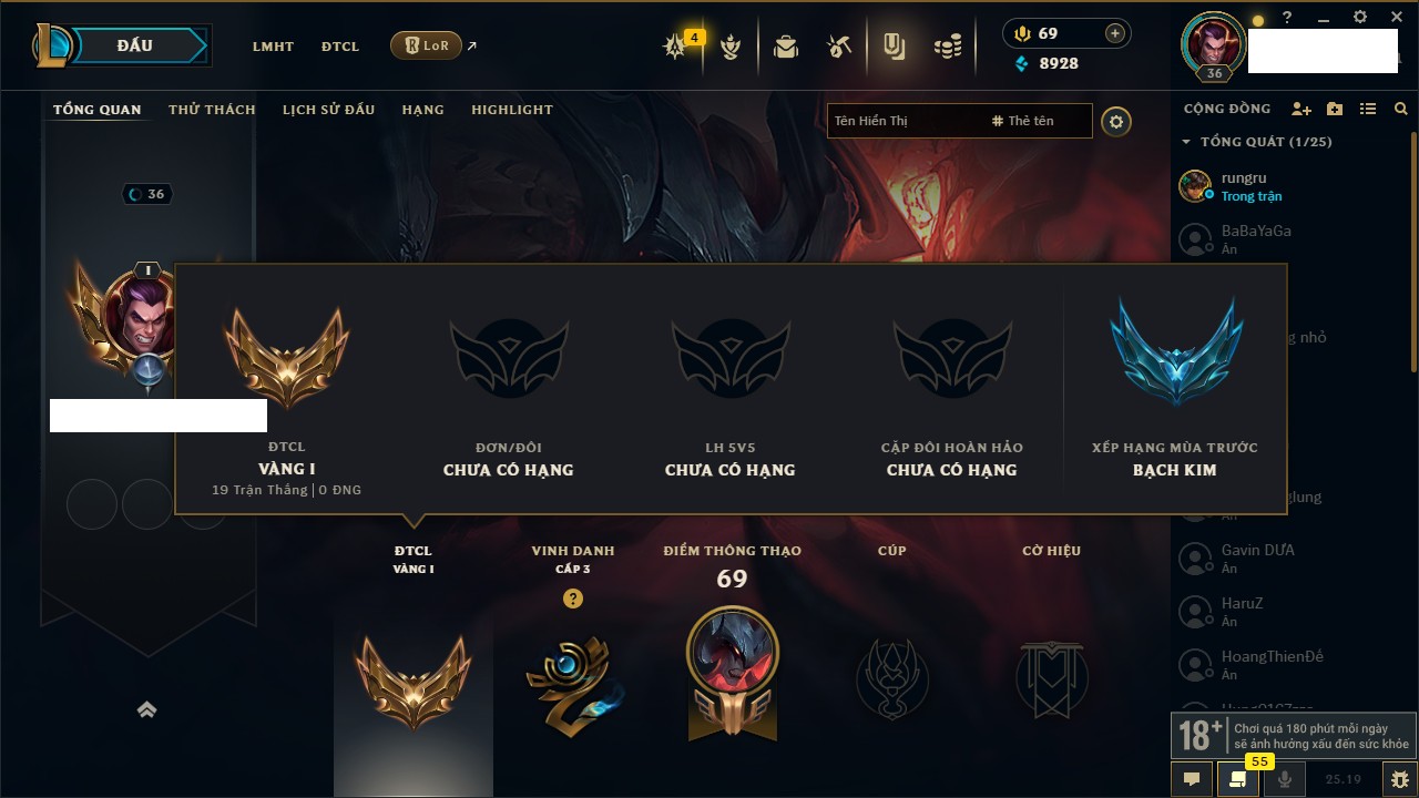 Rank Đơn: Vàng III Khung: Vàng Tướng: 171 - Còn 91047 THX Trang Phục: 98 Rank ĐTCL: Bạch Kim IV Linh Thú: 281