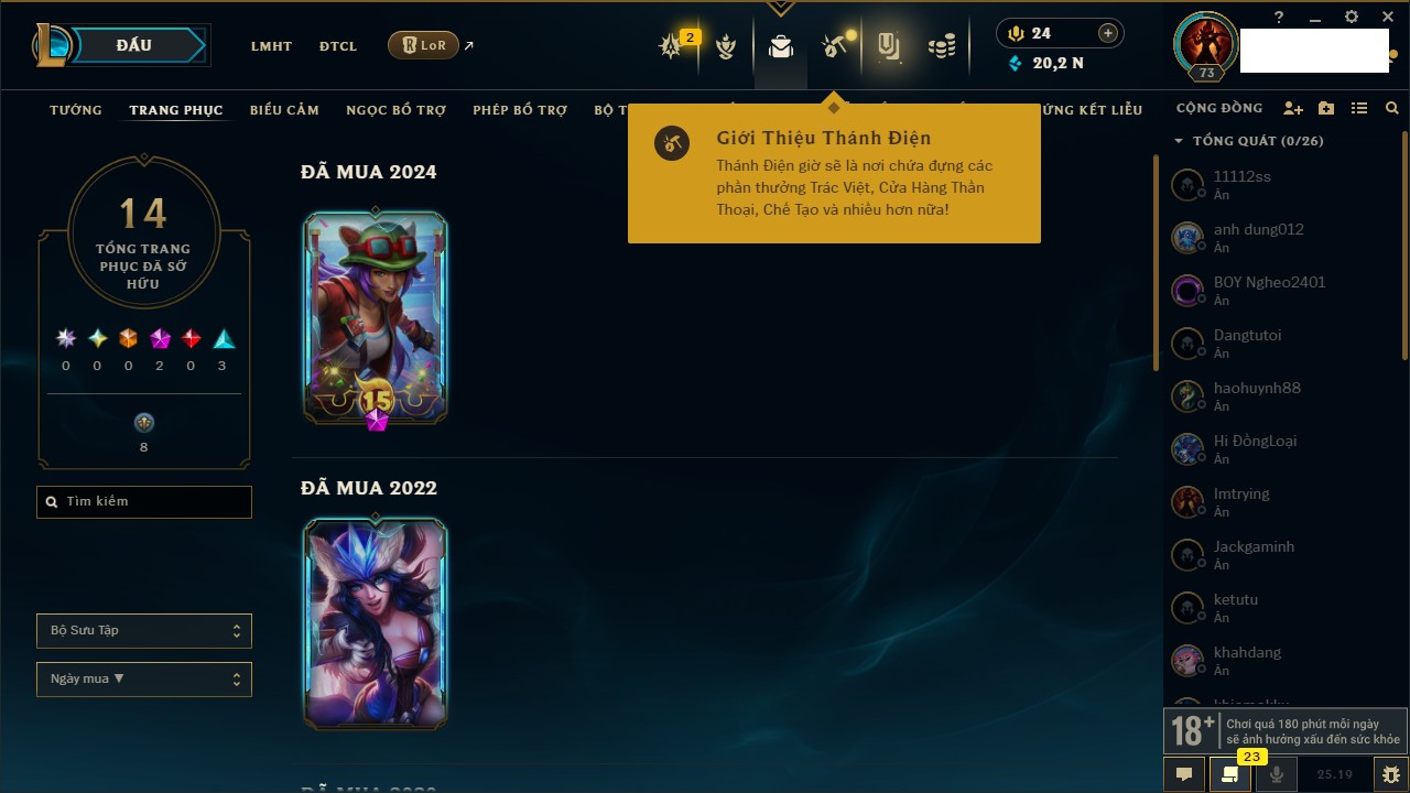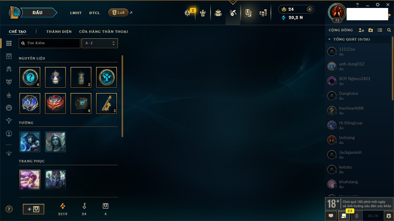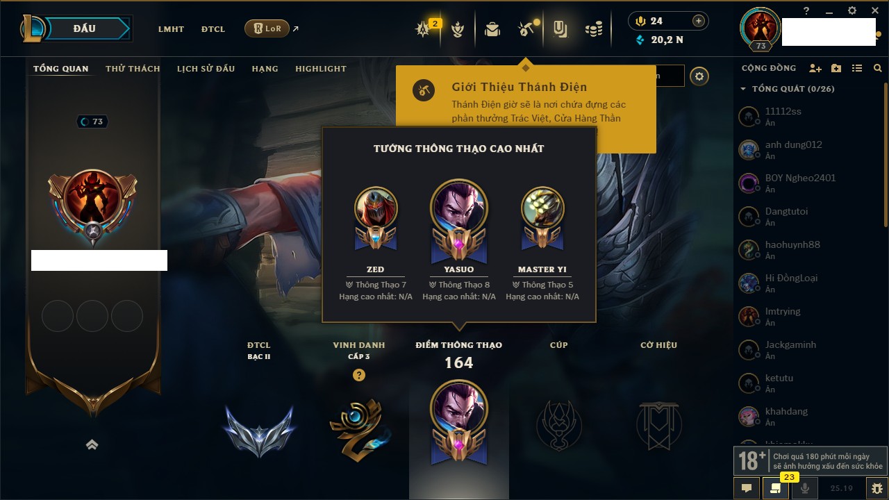 Rank Đơn: Chưa rank mùa nàoKhung: Chưa có khungTướng: 4 - Còn 17650 THXTrang Phục: 0Rank ĐTCL: Chưa RankLinh Thú: 24