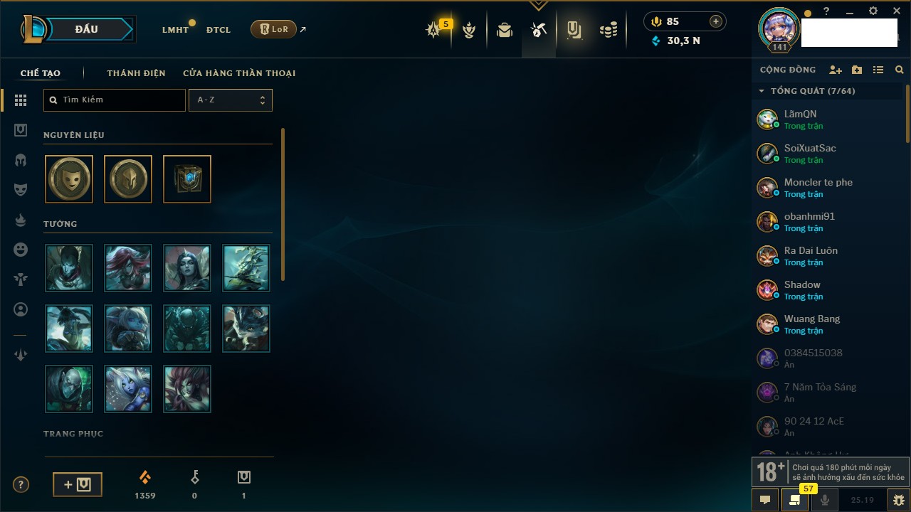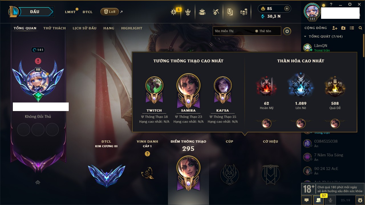 Rank Đơn: Bạch Kim IIKhung: Bạch kimTướng: 171 - Còn 316137 THXTrang Phục: 89Rank ĐTCL: Bạch Kim IIILinh Thú: 94