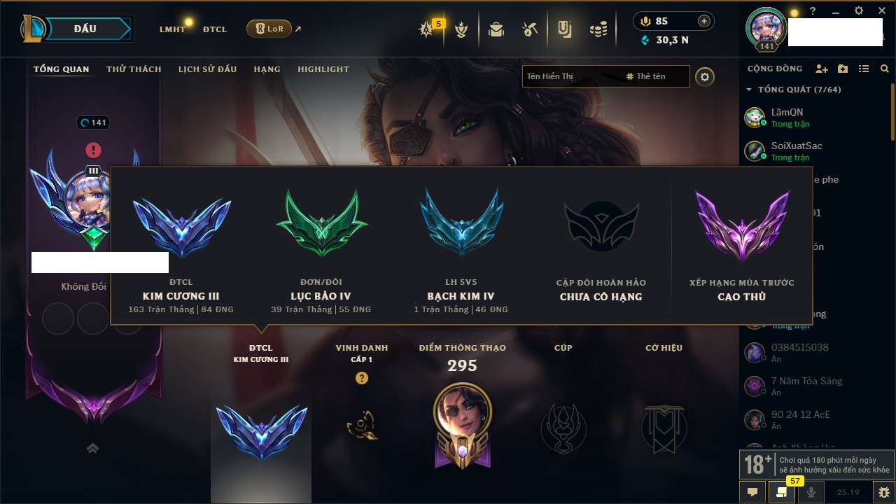 Rank Đơn: Lục Bảo IVKhung: VàngTướng: 171 - Còn 154648 THXTrang Phục: 203Rank ĐTCL: Bạch Kim IVLinh Thú: 69