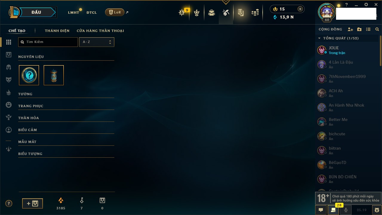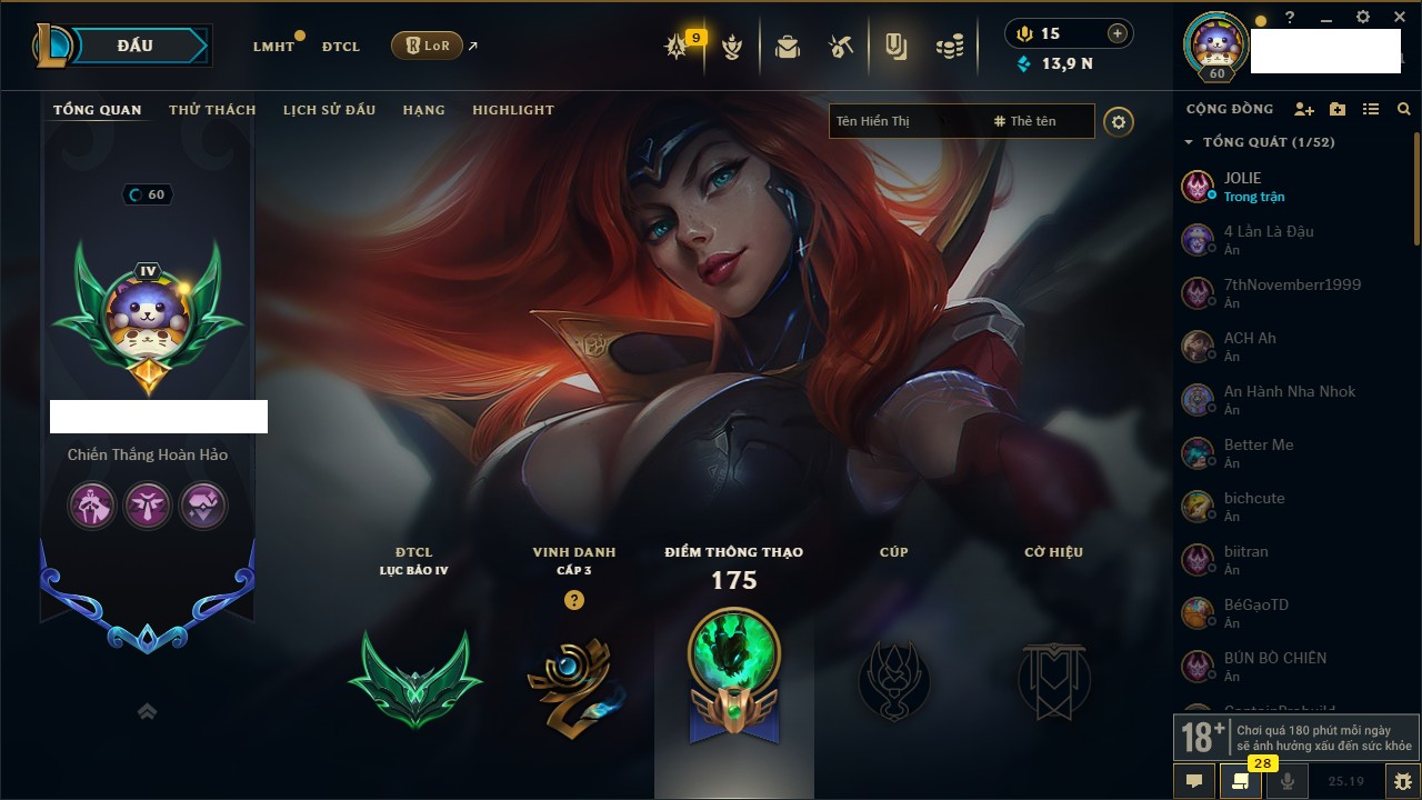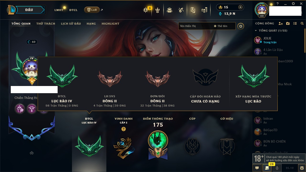 Rank Đơn: Bạc IIKhung: VàngTướng: 171 - Còn 332462 THXTrang Phục: 165Rank ĐTCL: Kim Cương IVLinh Thú: 181