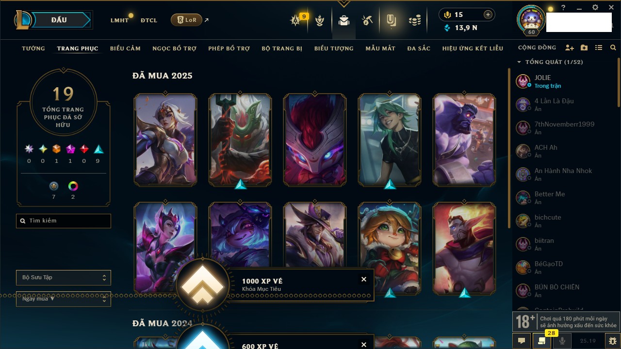 Rank Đơn: Vàng IVKhung: BạcTướng: 166 - Còn 180925 THXTrang Phục: 163Rank ĐTCL: Chưa RankLinh Thú: 67