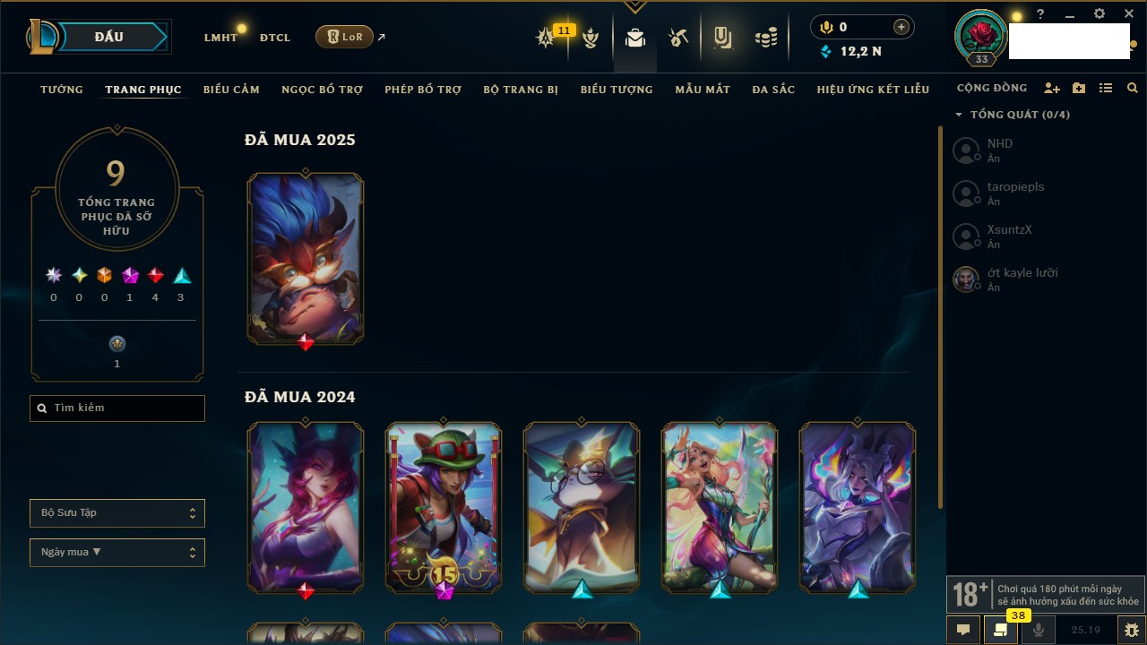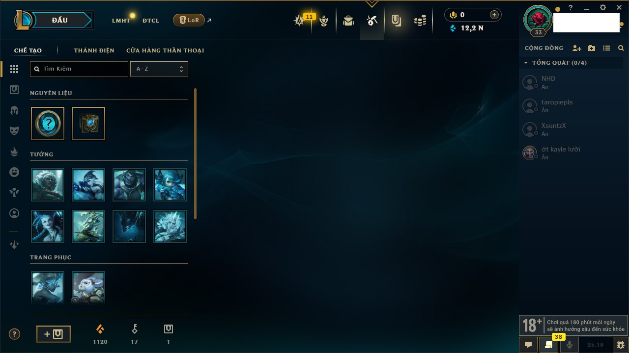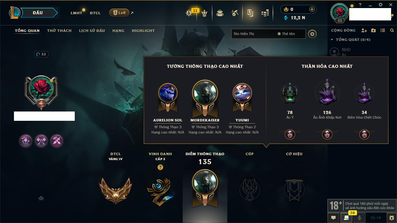 Rank Đơn: Chưa RankKhung: Chưa có khungTướng: 118 - Còn 13712 THXTrang Phục: 117Rank ĐTCL: Chưa RankLinh Thú: 34