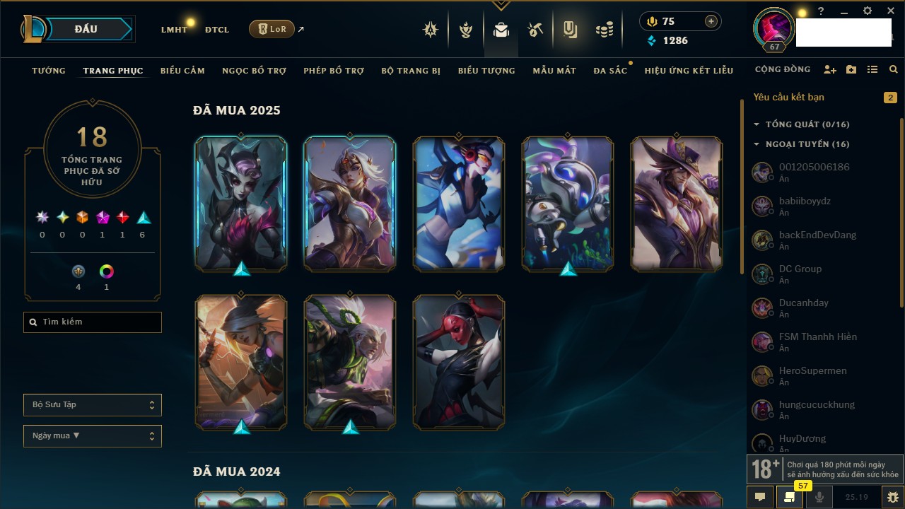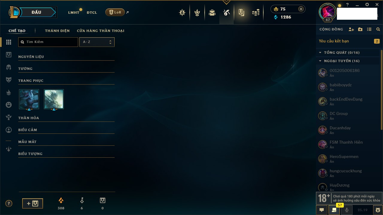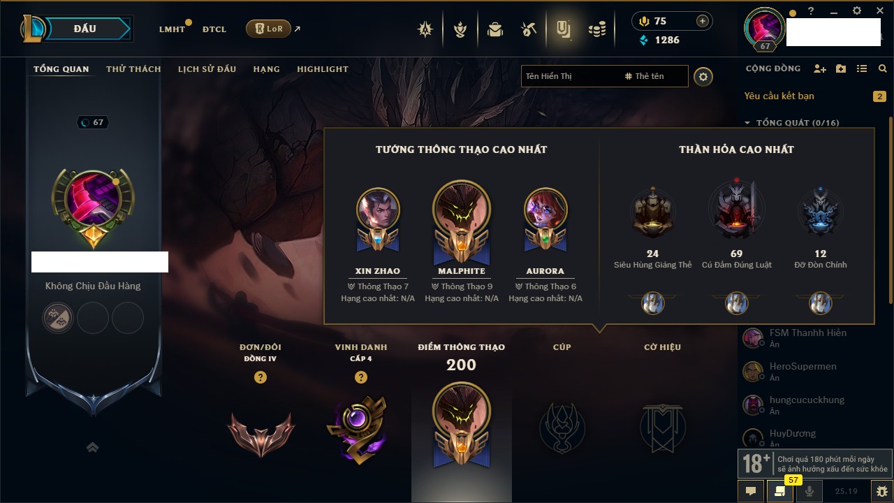 Rank Đơn: Vàng IIKhung: VàngTướng: 171 - Còn 219803 THXTrang Phục: 254Rank ĐTCL: Chưa RankLinh Thú: 78