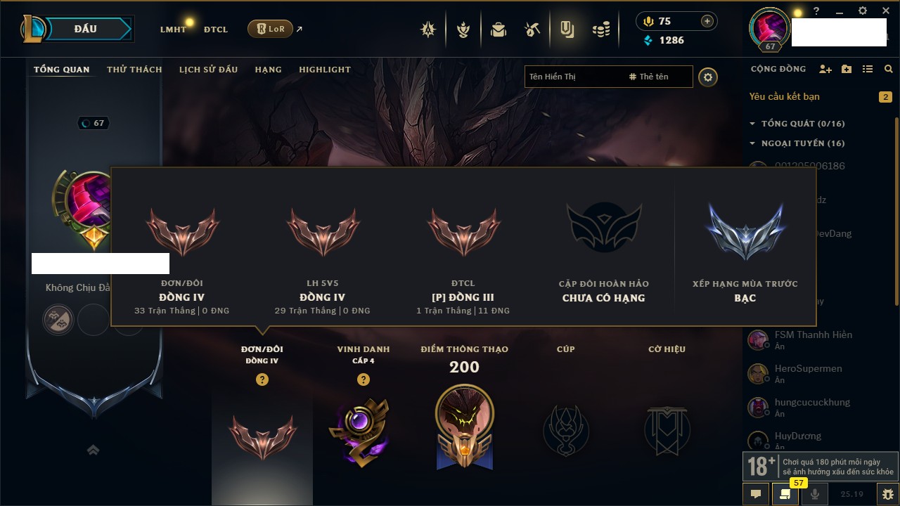 Rank Đơn: Sắt IIIKhung: SắtTướng: 171 - Còn 62070 THXTrang Phục: 198Rank ĐTCL: Bạch Kim IIILinh Thú: 237