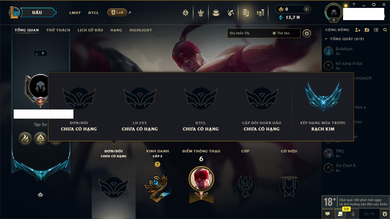 Rank Đơn: Bạch Kim IIKhung: Bạch kimTướng: 171 - Còn 141298 THXTrang Phục: 274Rank ĐTCL: Bạch Kim IILinh Thú: 188