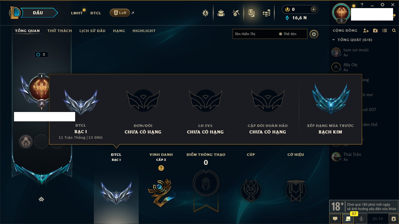 Rank Đơn: Lục Bảo IVKhung: VàngTướng: 171 - Còn 154648 THXTrang Phục: 203Rank ĐTCL: Bạch Kim IVLinh Thú: 69