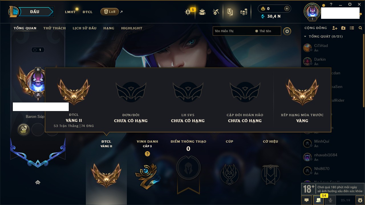 Rank Đơn: Vàng IIIKhung: BạcTướng: 171 - Còn 101359 THXTrang Phục: 88Rank ĐTCL: Kim Cương IVLinh Thú: 200