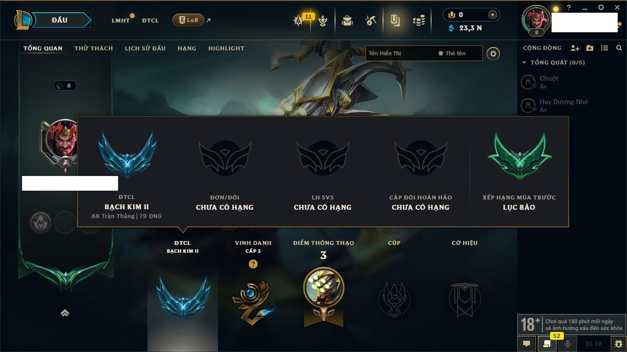 Rank Đơn: Lục Bảo IVKhung: VàngTướng: 171 - Còn 154648 THXTrang Phục: 203Rank ĐTCL: Bạch Kim IVLinh Thú: 69