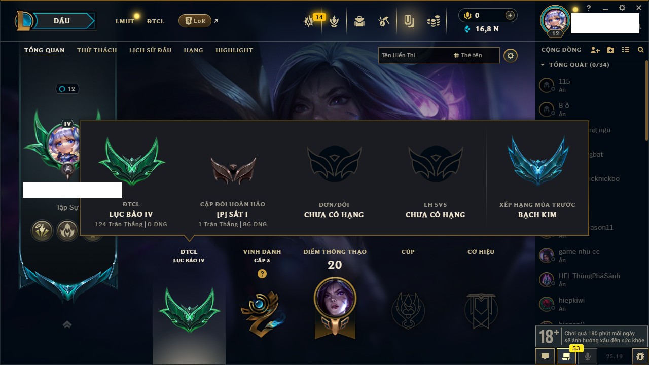 Rank Đơn: Chưa rank mùa nàoKhung: Chưa có khungTướng: 1 - Còn 3000 THXTrang Phục: 0Rank ĐTCL: Vàng ILinh Thú: 6