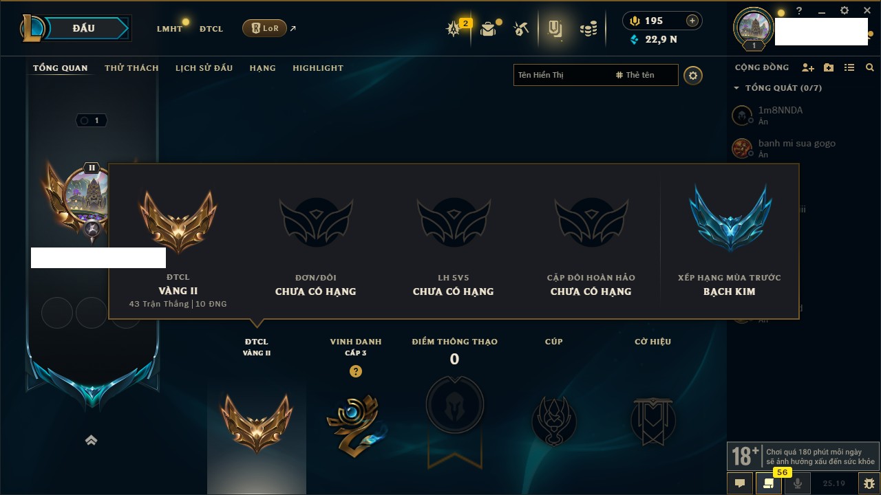 Rank Đơn: Lục Bảo IVKhung: VàngTướng: 171 - Còn 154648 THXTrang Phục: 203Rank ĐTCL: Bạch Kim IVLinh Thú: 69
