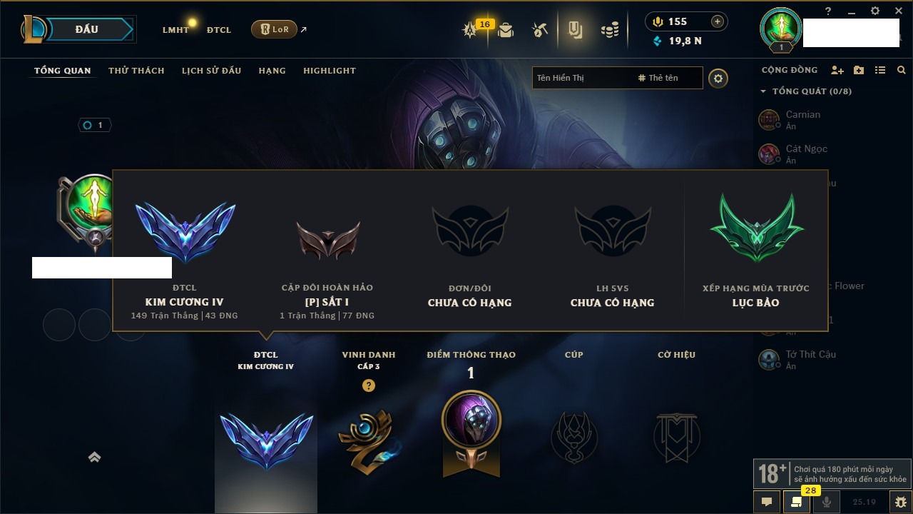 Rank Đơn: Bạc IIKhung: Chưa có khungTướng: 145 - Còn 12230 THXTrang Phục: 183Rank ĐTCL: Chưa RankLinh Thú: 71