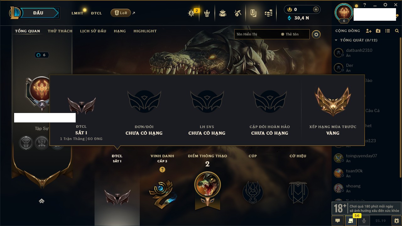 Rank Đơn: Lục Bảo IVKhung: VàngTướng: 171 - Còn 154648 THXTrang Phục: 203Rank ĐTCL: Bạch Kim IVLinh Thú: 69
