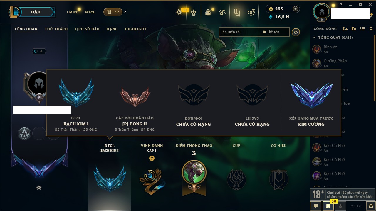 Rank Đơn: Bạch Kim IIKhung: Bạch kimTướng: 171 - Còn 315217 THXTrang Phục: 238Rank ĐTCL: Bạch Kim ILinh Thú: 116
