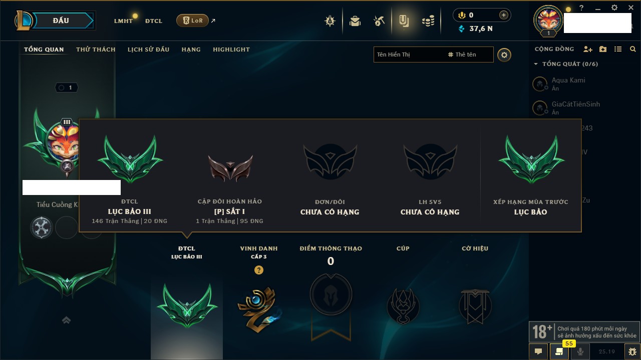 Rank Đơn: Vàng IIKhung: VàngTướng: 171 - Còn 219803 THXTrang Phục: 254Rank ĐTCL: Chưa RankLinh Thú: 78