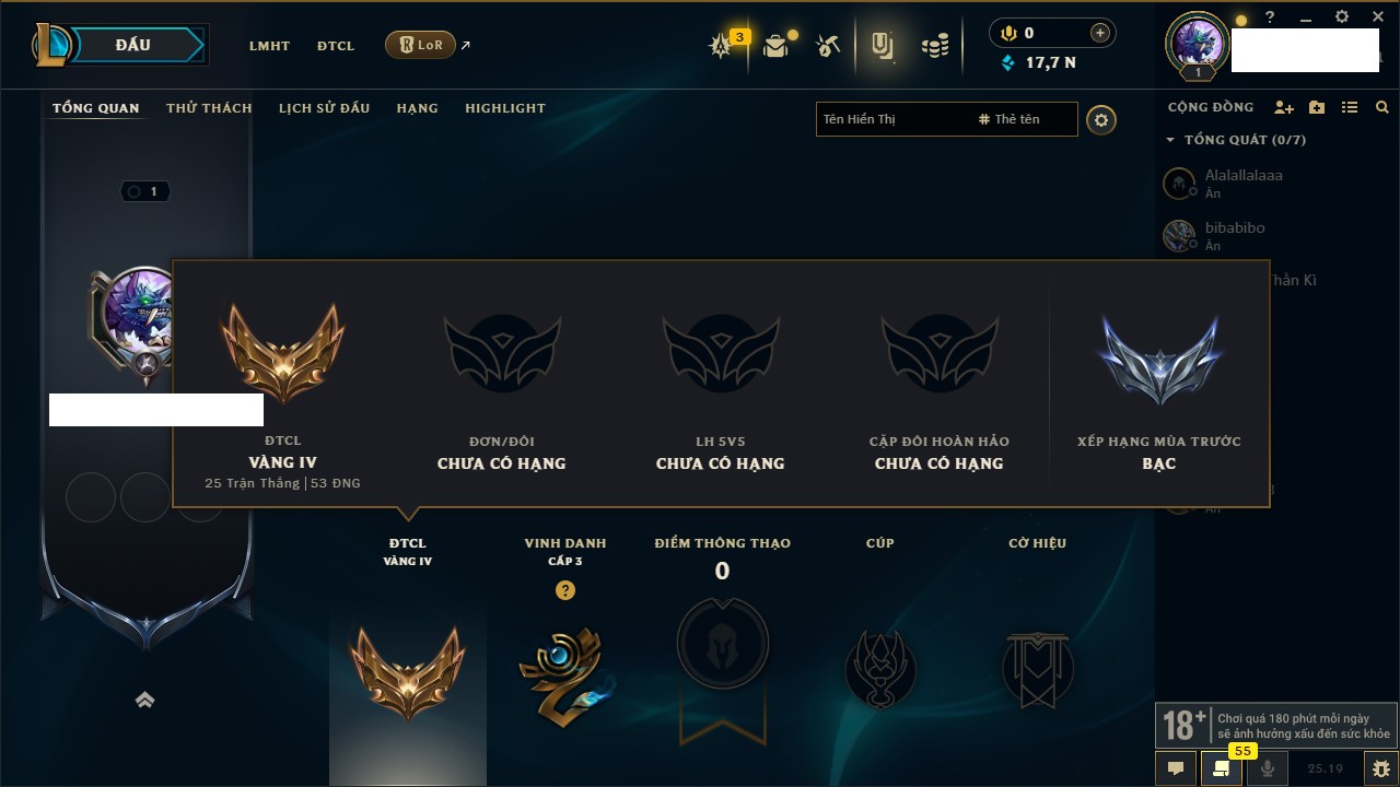 Rank Đơn: Sắt IKhung: Chưa có khungTướng: 171 - Còn 89600 THXTrang Phục: 513Rank ĐTCL: Chưa RankLinh Thú: 57