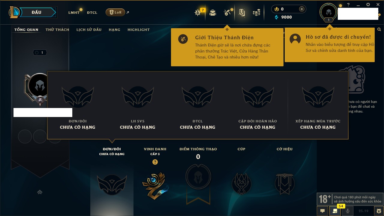 Rank Đơn: Bạc IIKhung: Chưa có khungTướng: 145 - Còn 12230 THXTrang Phục: 183Rank ĐTCL: Chưa RankLinh Thú: 71